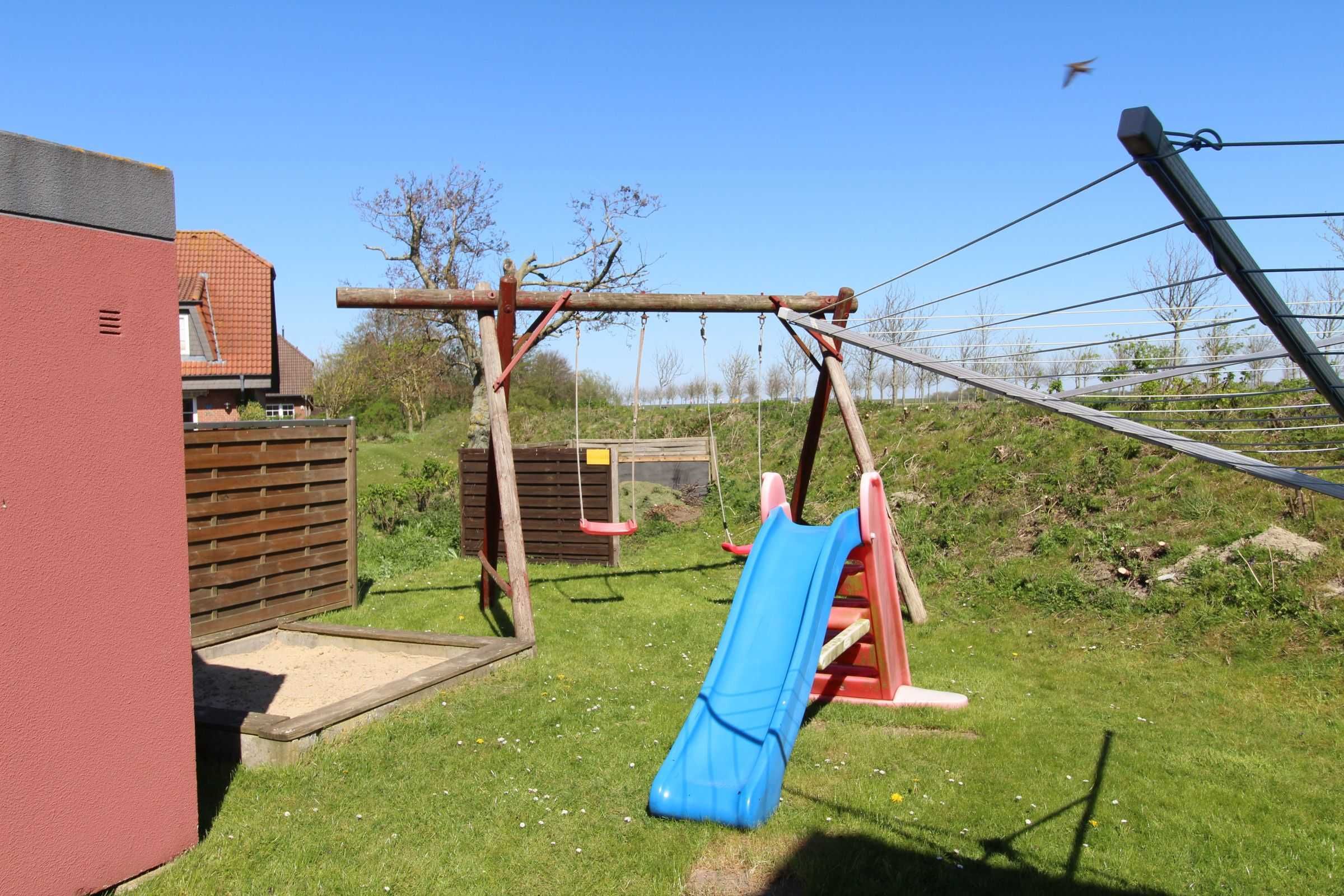 Es erwartet Sie eine große Spiel- und Liegewiese mit Schaukel und Sandkiste. Terrasse, Gartenmöbel, Strandkorb, Liegen, Markise und Grill.