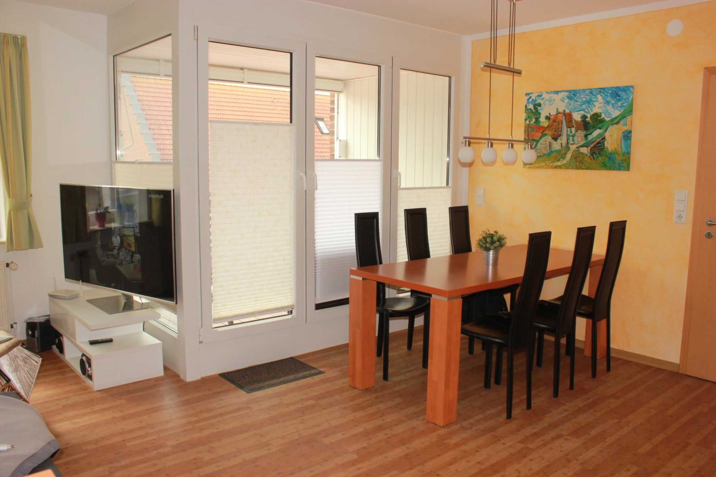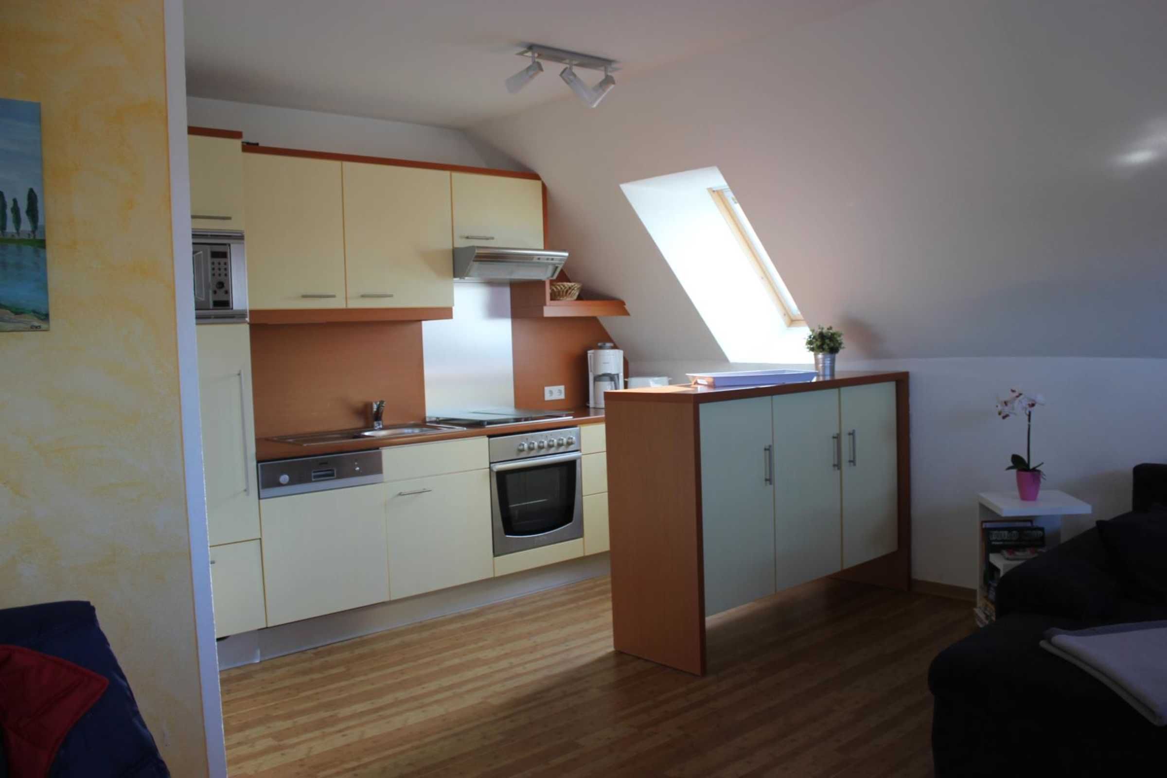 Im unteren Teil finden Sie ein großzügiges Wohn-/Esszimmer. Hier können Sie in der schönen Einbauküche gemeinsam kochen. Die Küche ist für bis zu 6 Pers. umfangreich ausgestattet. Kochinsel mit Ceranfeld und Dunstabzugshaube, gegenüber Backofen und Geschirrspüler sind selbstverständlich vorhanden.