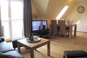 Kabel-TV-Fernseher,Mini-HiFi-Anlage/CD, DVD Player, Kaffeemaschine, Kaffeepadmaschine, Mikrowelle, Wasserkocher, große Spülmaschine, Elektroherd, Haartrockner,erweiterte und sehr umfangreiche Küchenausstattung, Verdunklungsrollos in den Schlafzimmern und in der Küche, Balkon mit Sitzmöbeln, kinderfreundliche Zusatzausstattung, wie z.B. Kinderhochstuhl und Reisebett, Tritthocker/Kindertoilettensitz, Steckdosensicherung, Spiele u.v.m.