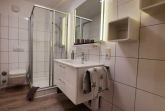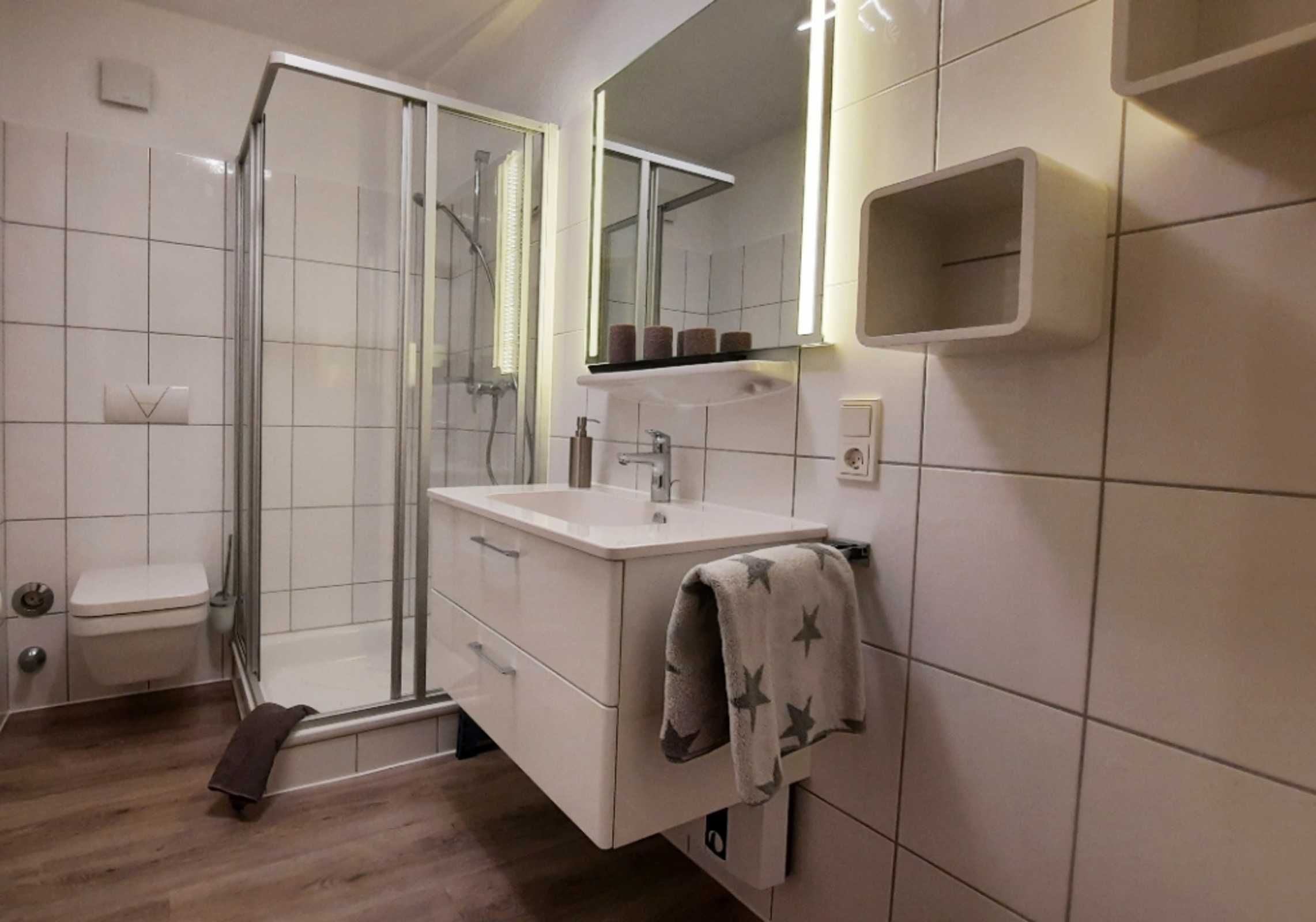 Das renovierte Badezimmer verfügt über Dusche, WC, Schränke, Tritthocker und Föhn.