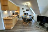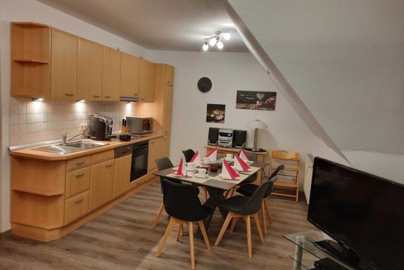 Die vollausgestattete Küche bietet einen Kühlschrank, Gefrierfach, Mikrowelle, Wasserkocher, Backofen, Spülmaschine, sowie eine Kaffeemaschine für Filterkaffee. Der gemütliche Essbereich bietet genügend Platz für gemeinsame Mahlzeiten.