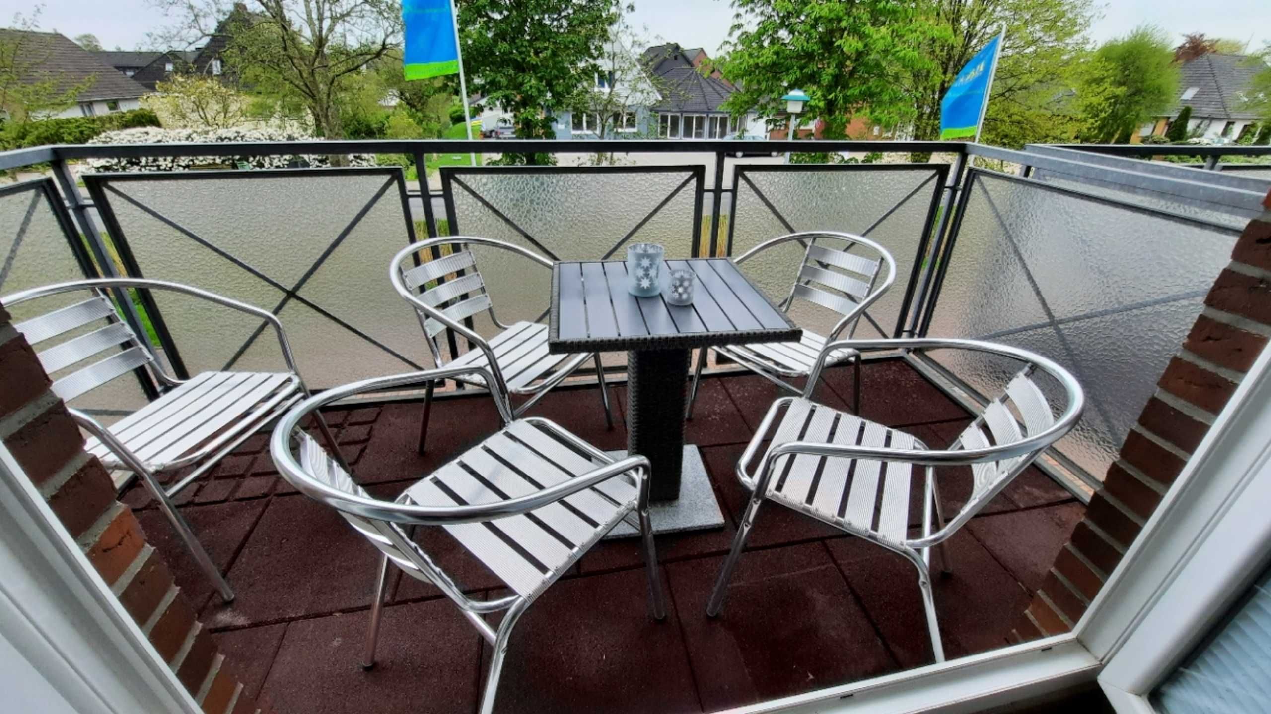 Der kleine aber gemütliche Balkon mit Deichblick lädt zum Verweilen ein.