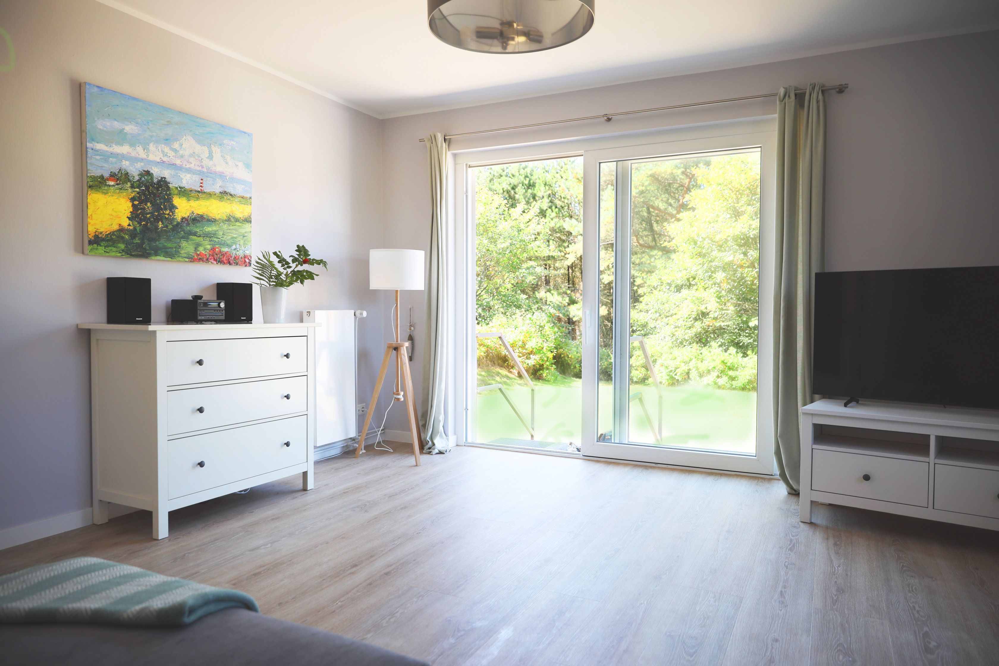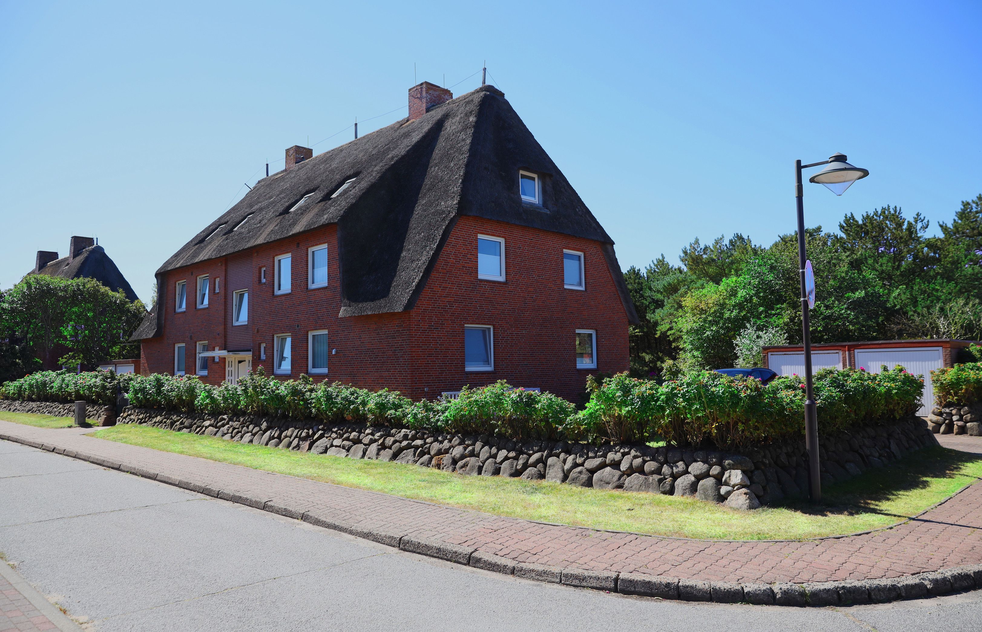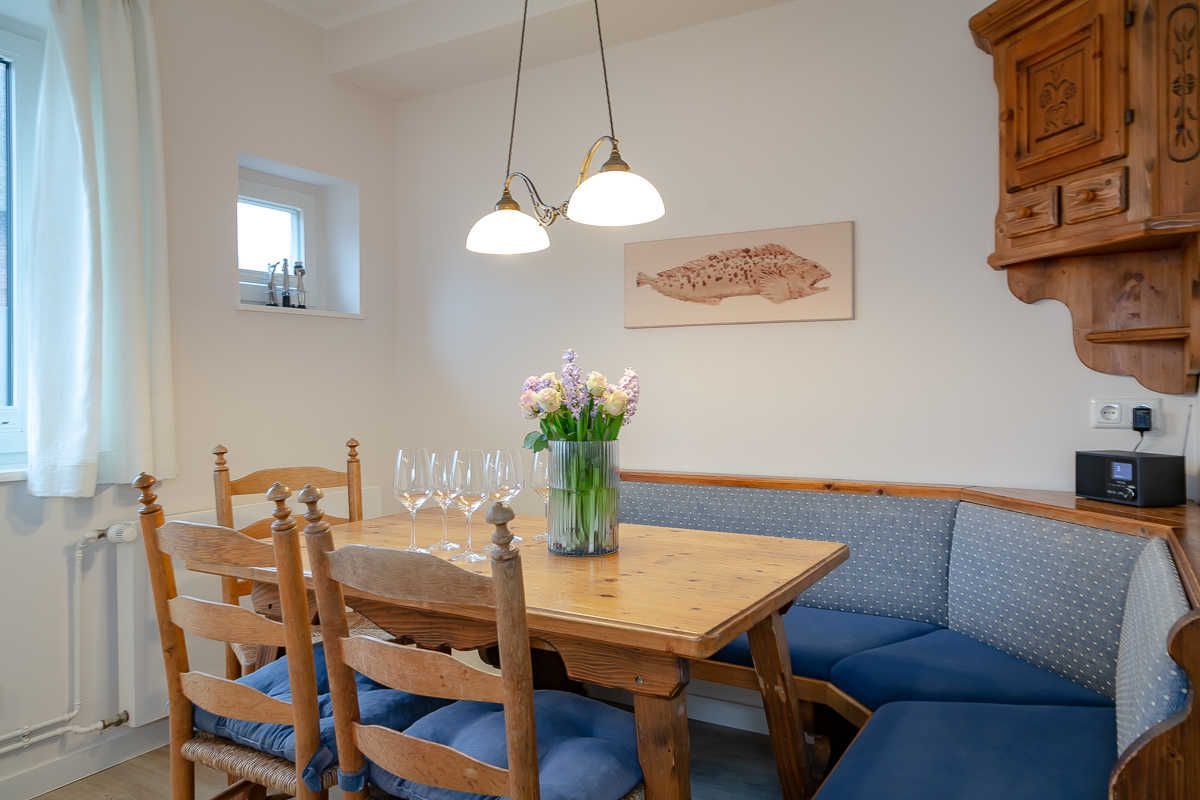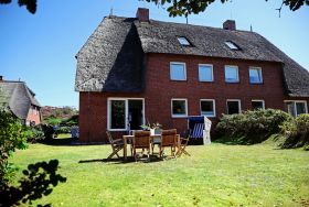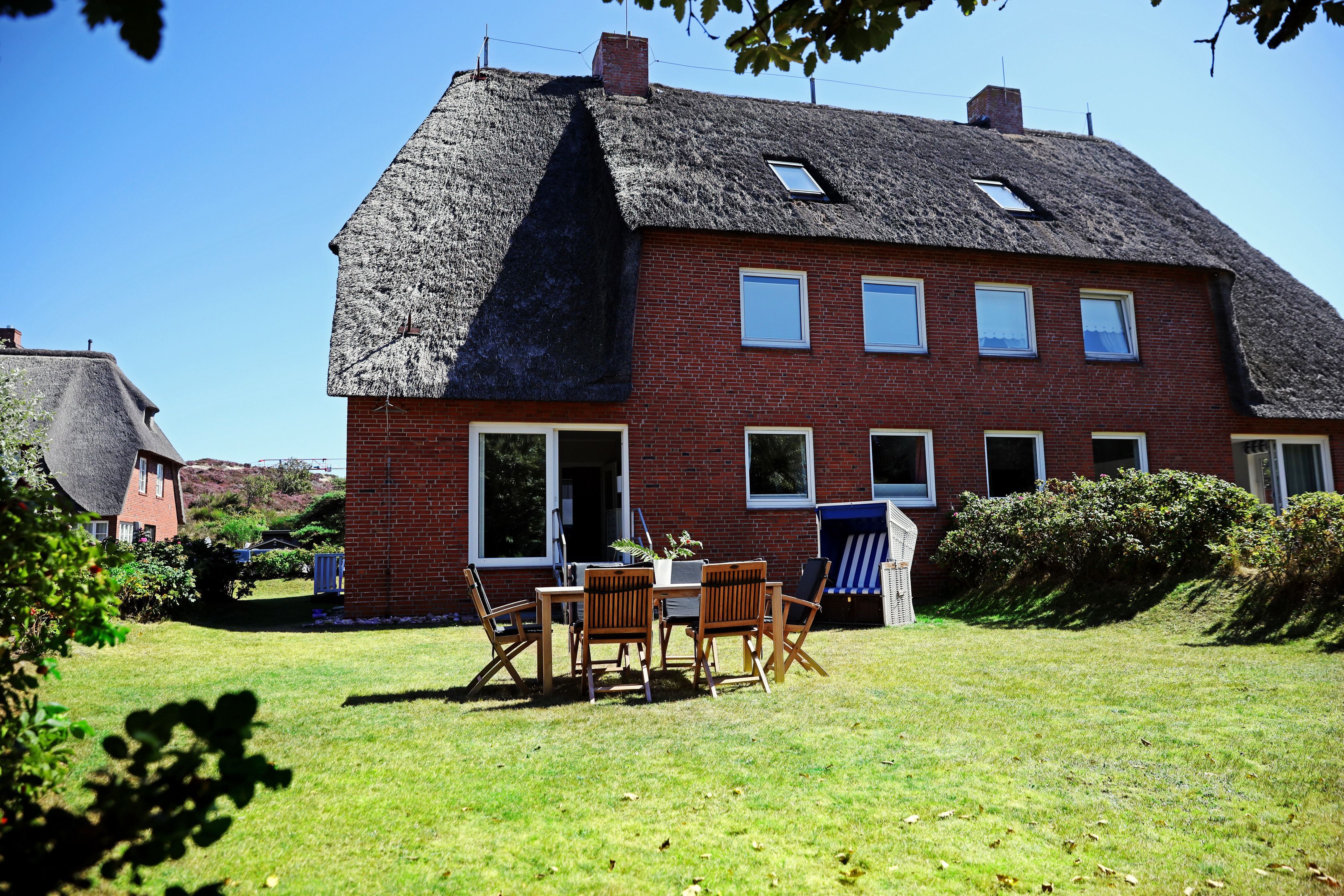Das Apartment Blomquist bietet Ihnen alles, um sich in Ihrem Urlaub auf Sylt sofort wie zu Hause zu fühlen. Das schöne Reetdachhaus mit Heckenrosenwall liegt am Ende einer ruhigen Anwohnerstraße. Die moderne und gemütliche Ferienwohnung ist perfekt für Familien und alle, die gern etwas mehr Platz haben möchten. Es gibt ein großes Wohnzimmer, zwei Schlafzimmer mit Doppelbett und ein Zimmer mit einem Etagenhochbett für z.B. zwei Kinder (Matratzenlänge 2m). Die Wohnung ist 2022 renoviert und erneuert worden. Ein Highlight ist der wunderschöne, große Garten, der an ein Wäldchen angrenzt. Sie können dort im eigenen Strandkorb liegen oder auf den Gartenmöbeln entspannen, draußen essen und Kinder ohne Sorge spielen lassen. Und sollte das Wetter doch mal typisch norddeutsch sein, bietet das Wohnzimmer genügend Platz, eine große moderne Couchgarnitur, einen Smart TV und WLAN. Auch die Küche besitzt eine gemütliche, typisch friesische Ess-Ecke für die ganze Familie und ist vollausgestattet, inklusive Nespressomaschine, Milchaufschäumer, Wasserkocher, Kühlschrank, Herd/Backofen und Spülmaschine. Das Tageslichtbad bietet eine Dusche, einen modernen Handtuchheizkörper und eine Waschmaschine mit Trocknerfunktion. Zusätzlich gibt es ein kleines separates Gäste-WC.