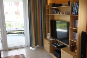 Sie wohnen in einem 3-Zimmer-Appartement für bis zu 6 Personen auf ca. 69 m² im Erdgeschoss. Zwei Schlafzimmer mit Doppelbett mit SAT-TV, großer heller Wohn-/Schlafraum mit bequemer Doppelbettcouch, separater Essplatz, voll ausgestatteter Küchenbereich mit Geschirrspüler und Mikrowelle, Dusche/WC, großer möblierter Balkon, Abstellraum, SAT-TV (Flachbildschirm) und Mini-HiFi-Anlage mit DVD-Player.