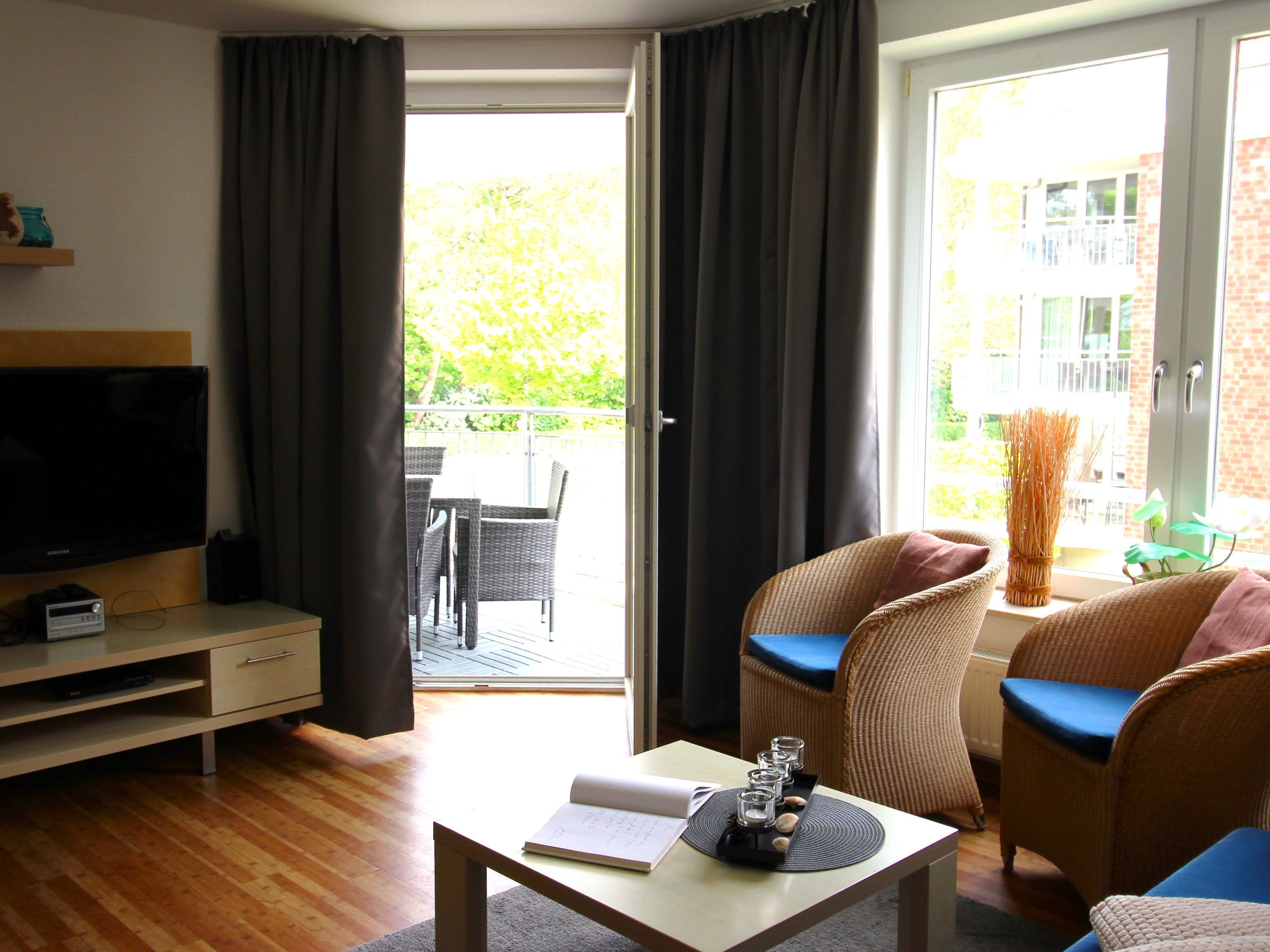 - Großes und helles Wohnzimmer mit Essplatz, gemütlicher Couch, Sesseln, Flachbild TV, Radio mit CD und DVD Player