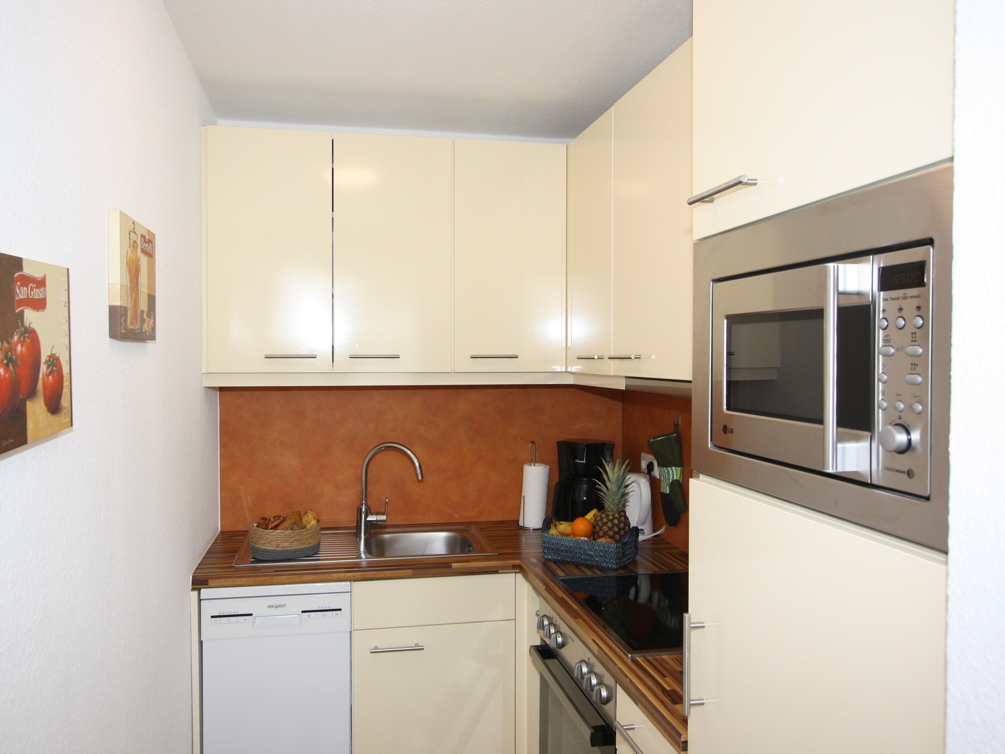 - Küche mit Herd und Ceranfeld, Dunstesse, Geschirrspüler, Mikrowelle, Wasserkocher, Kühlschrank, Toaster und sebstverständlich ausreichend Geschirr