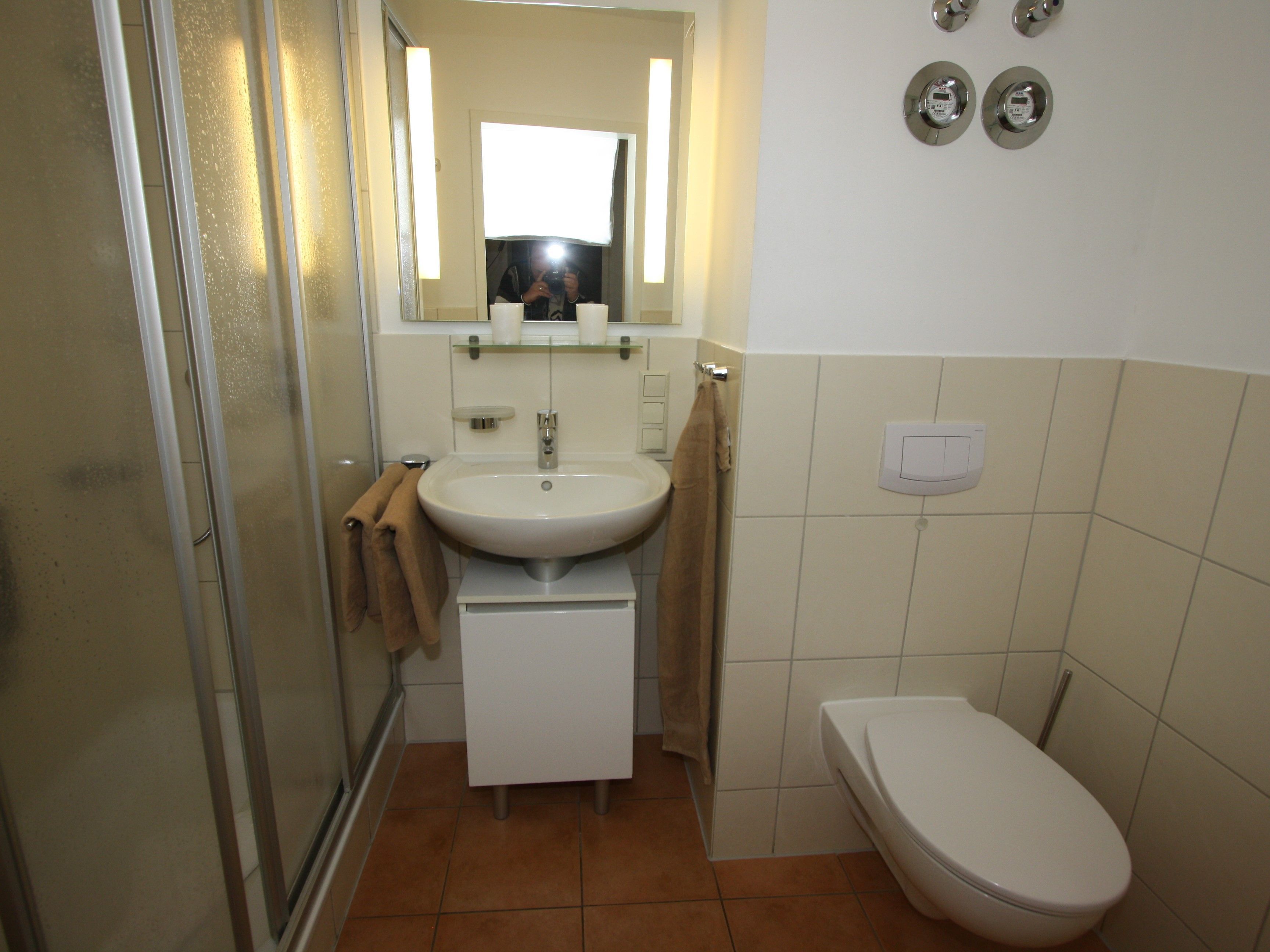 - Bad mit WC, Dusche mit Duschkabine, Waschbecken und Haarföhn, Ablagemöglichkeiten