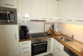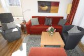 großes helles Wohnzimmer mit bequemer Schlafcouch, separater Essplatz, voll ausgestatteter Küchenbereich mit Geschirrspüler und Mikrowelle, Kaffee-Pad-Maschine, Dusche/WC,