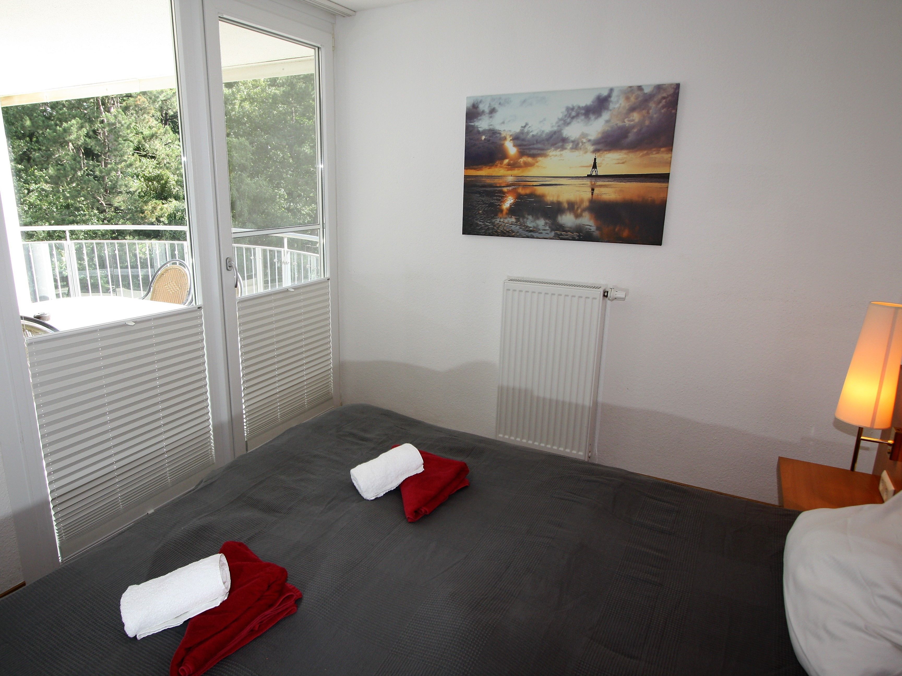 unsere 75 m² große 3–Zimmer–Ferienwohnung Nr. 1.25 für bis zu 6 Personen liegt im 2. OG mit teilweise Blick auf die See und ist mit dem Lift erreichbar. Es gibt einen 13 m² großen Balkon mit sechs Gartenstühlen und einem großen Tisch.