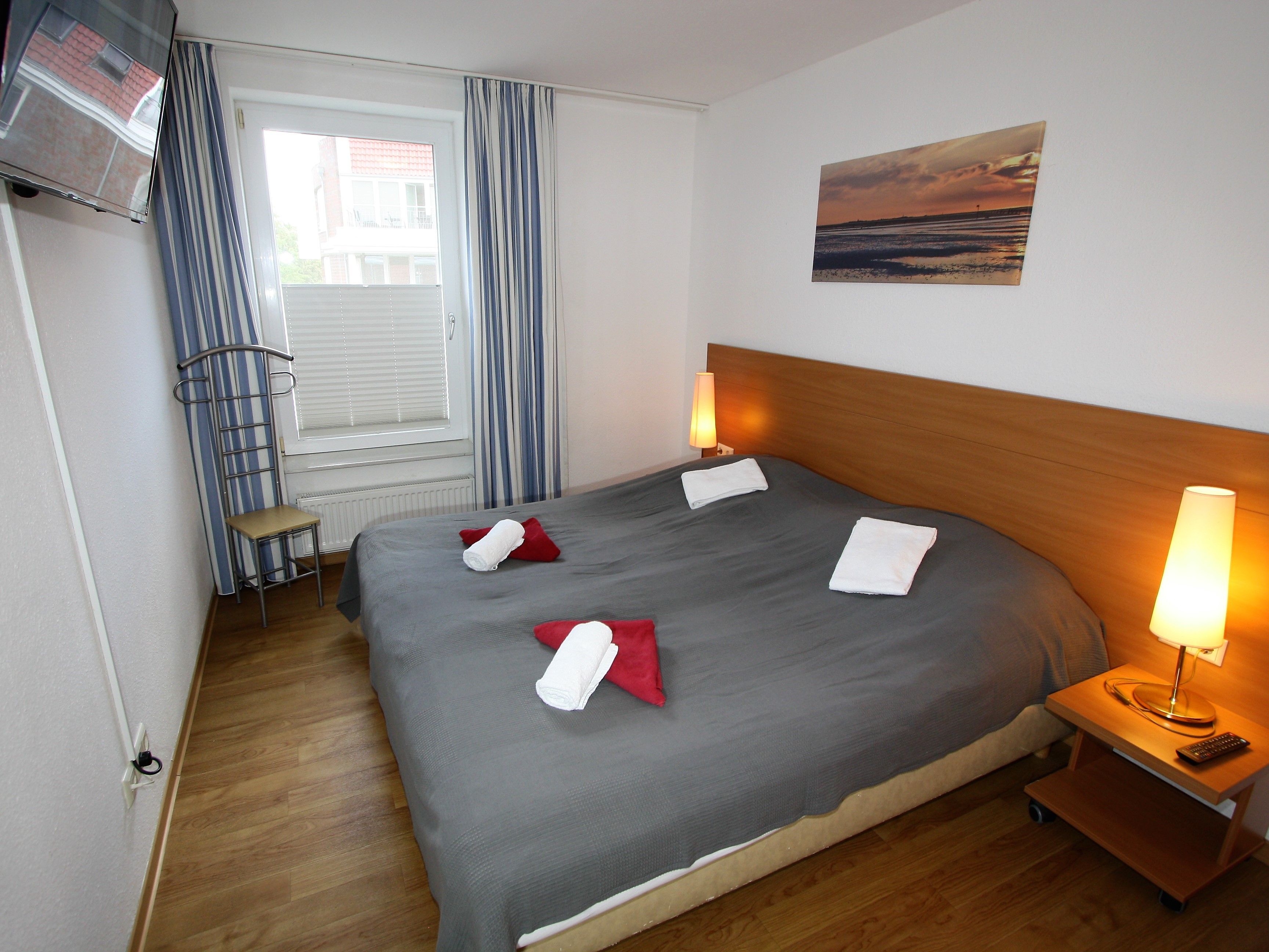 Wir haben zwei Schlafzimmer, eines davon mit Doppelbett und Flachbildfernseher, das andere mit zwei auch getrennt aufstellbaren Betten. Speziell abdunkelnde Plissees sorgen für einen erholsamen Schlaf, dies gilt auch für das Wohnzimmer.