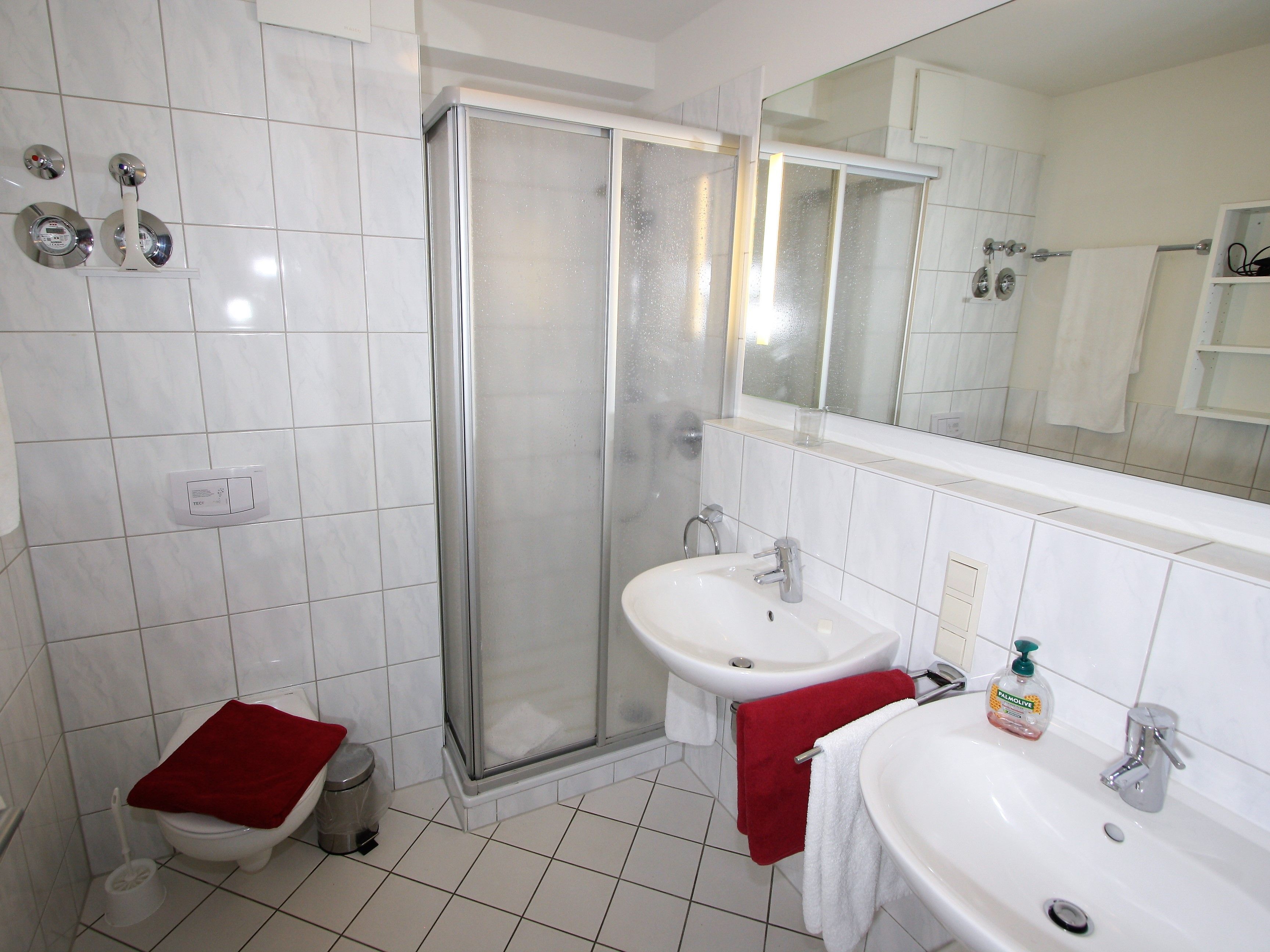 Unser Badezimmer hat eine Dusche mit extra flacher Duschtasse. Ein separates Gäste–WC mit großem Waschbecken sorgt dafür, dass es auch bei Vollbelegung der Wohnung nicht zu Engpässen kommt.
