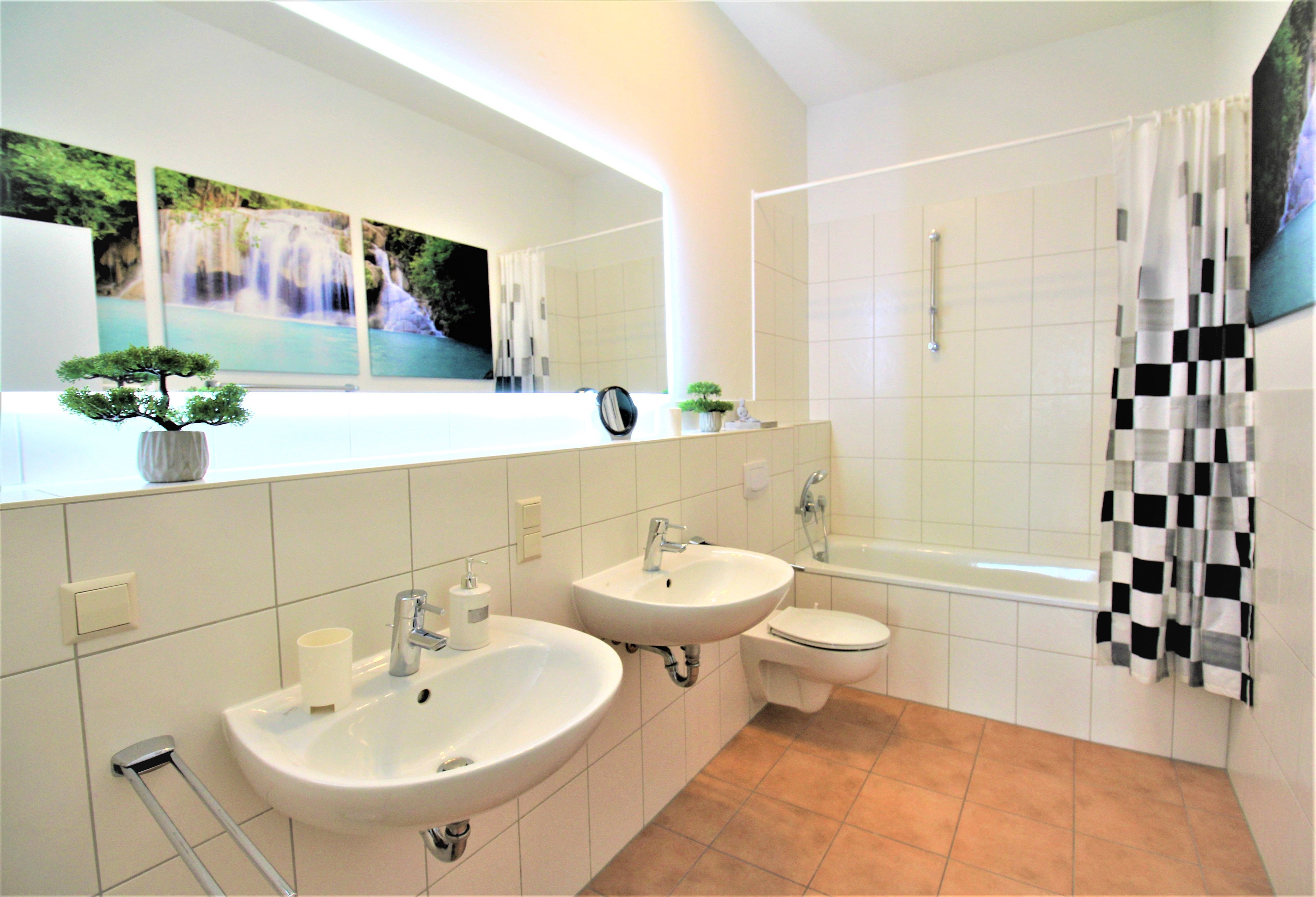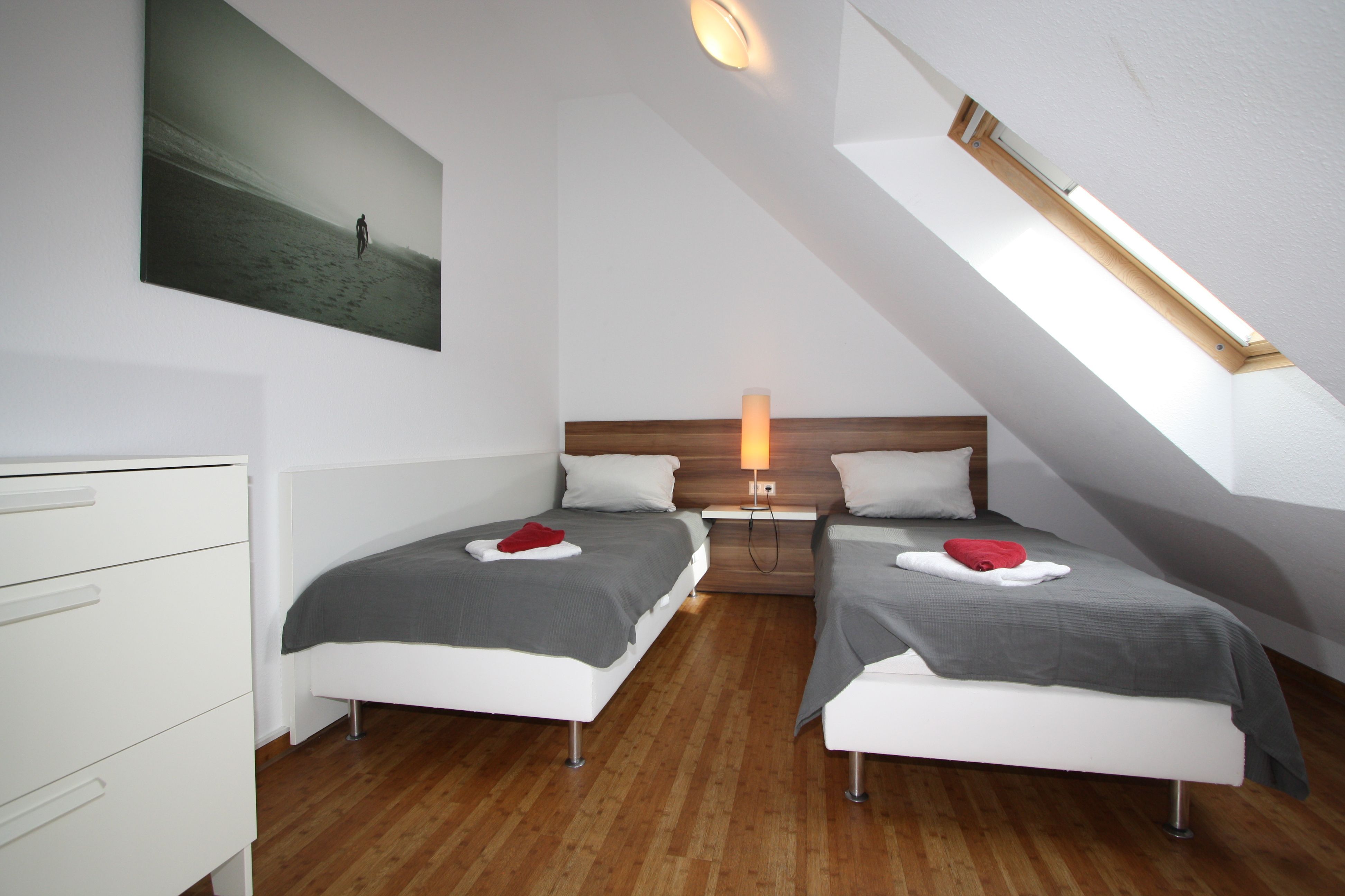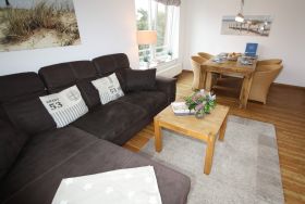 3-Zimmer-Maisonette bis 6 Personen, ca. 90 m², 1 Schlafzimmer mit Doppelbett, 1 Schlafzimmer mit getr. Bettten, großer heller Wohn-Schlafraum mit Doppelbettcouch, separater Essplatz, voll ausgestatteter Küchenbereich (siehe Seite 4) mit Geschirrspüler, Dusche/WC, Balkon, Abstellraum, SAT-TV, zusätzliches Bad