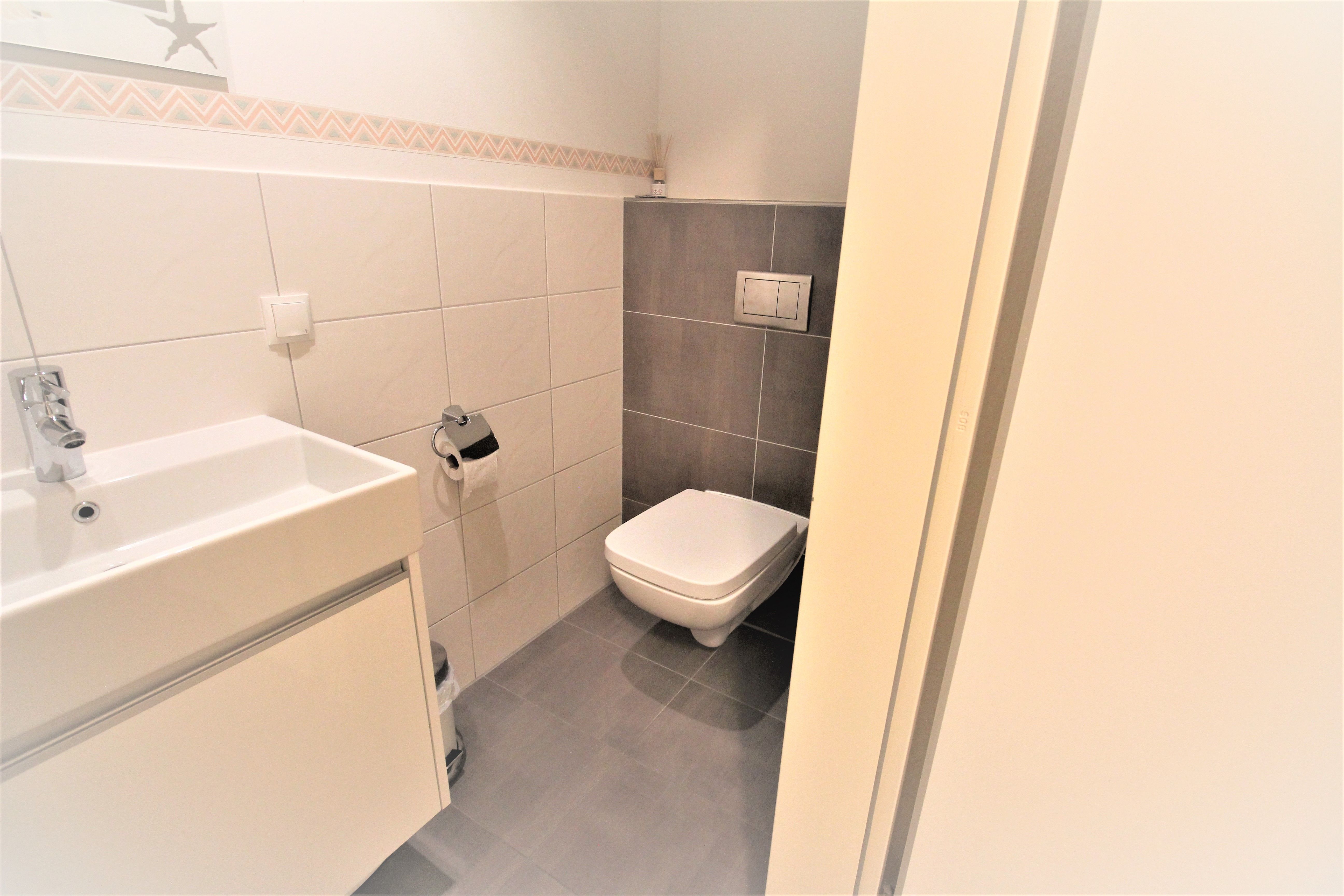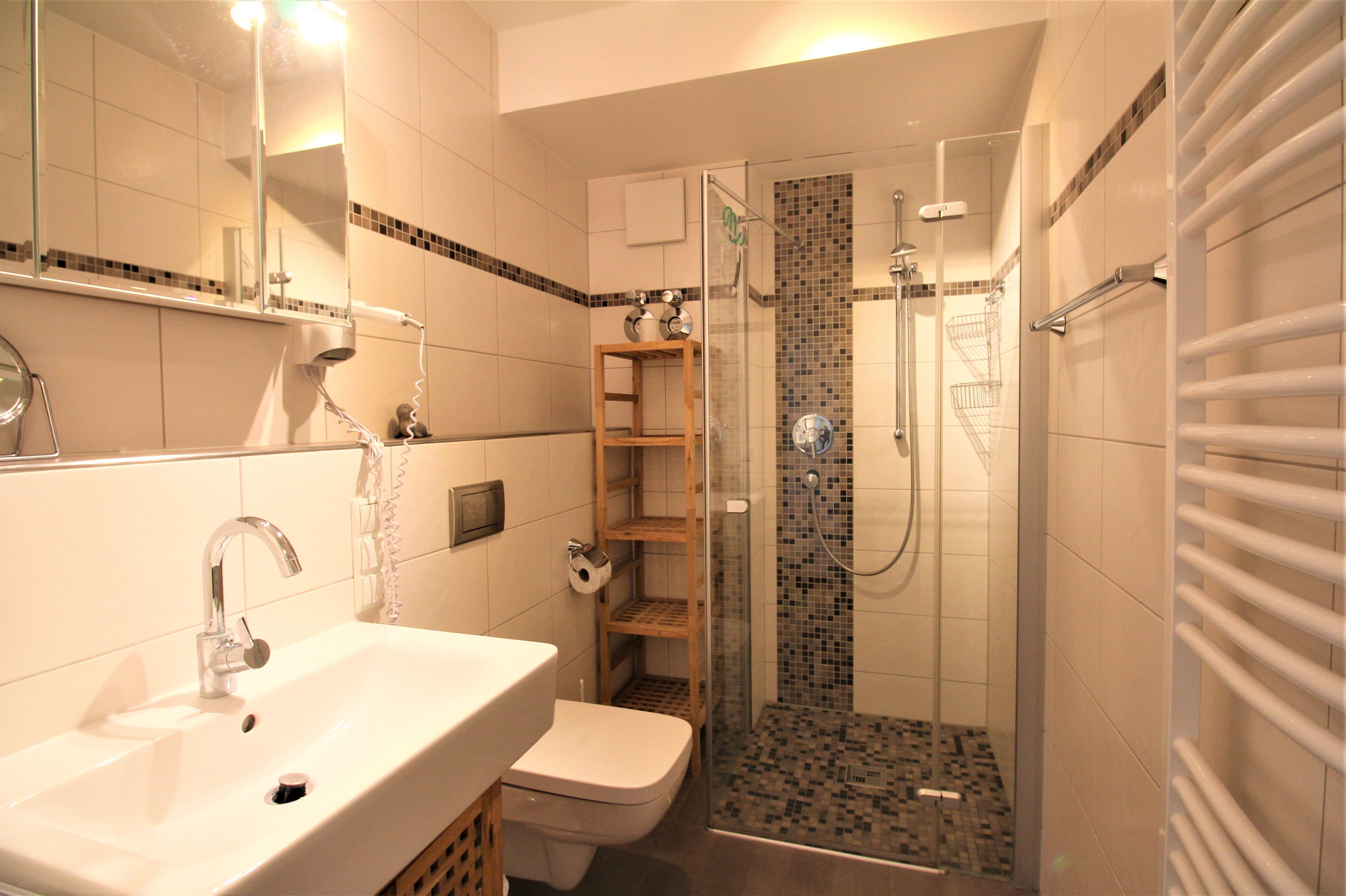 Im Bad finden Sie neben WC, Waschbecken und bodengleicher Dusche einen beleuchteten Spiegel und einen Föhn. Zusätzlich gibt es noch ein zweites WC mit großem Waschbecken.