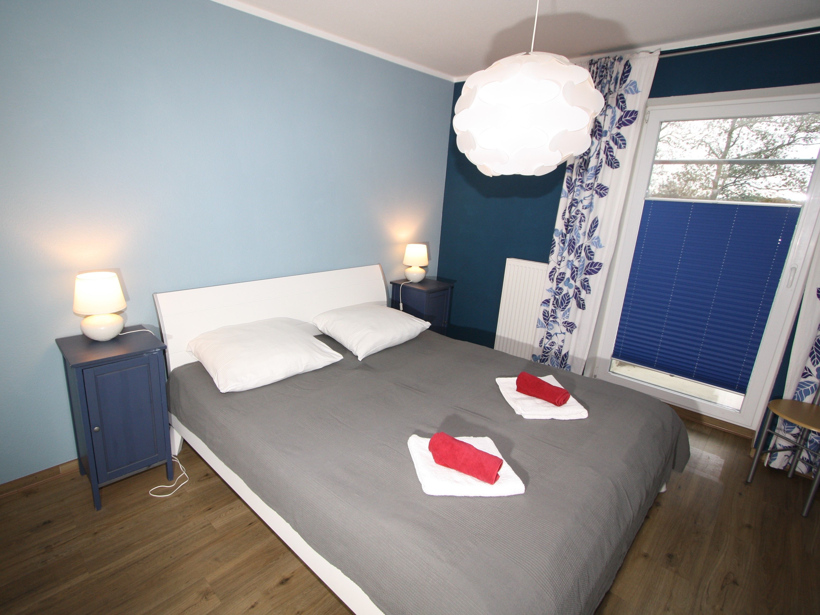 Das Schlafzimmer besteht aus einem Doppelbett mit einer Liegefläche von 180 cm x 200 cm.