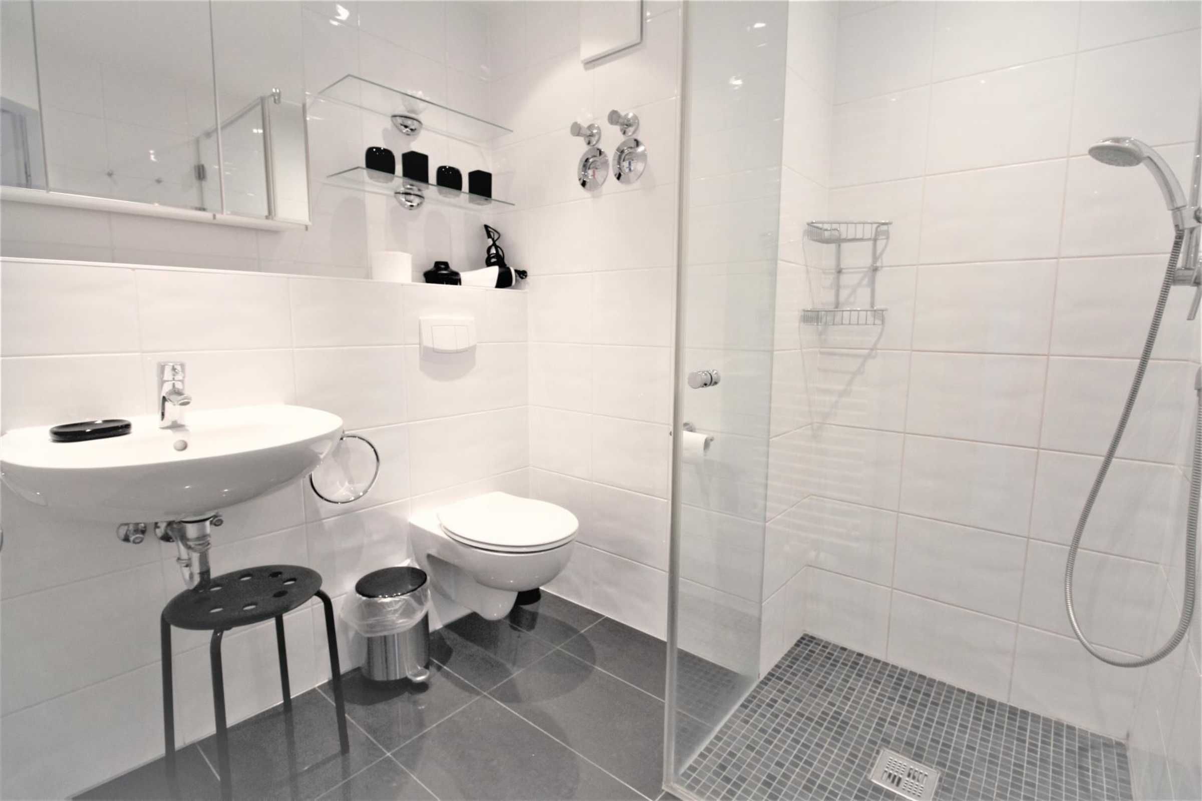 Im stilvollen Bad gibt es eine bodengleiche, barrierefreie Dusche mit Glastrennwand und rutschfesten Mosaikfliesen.