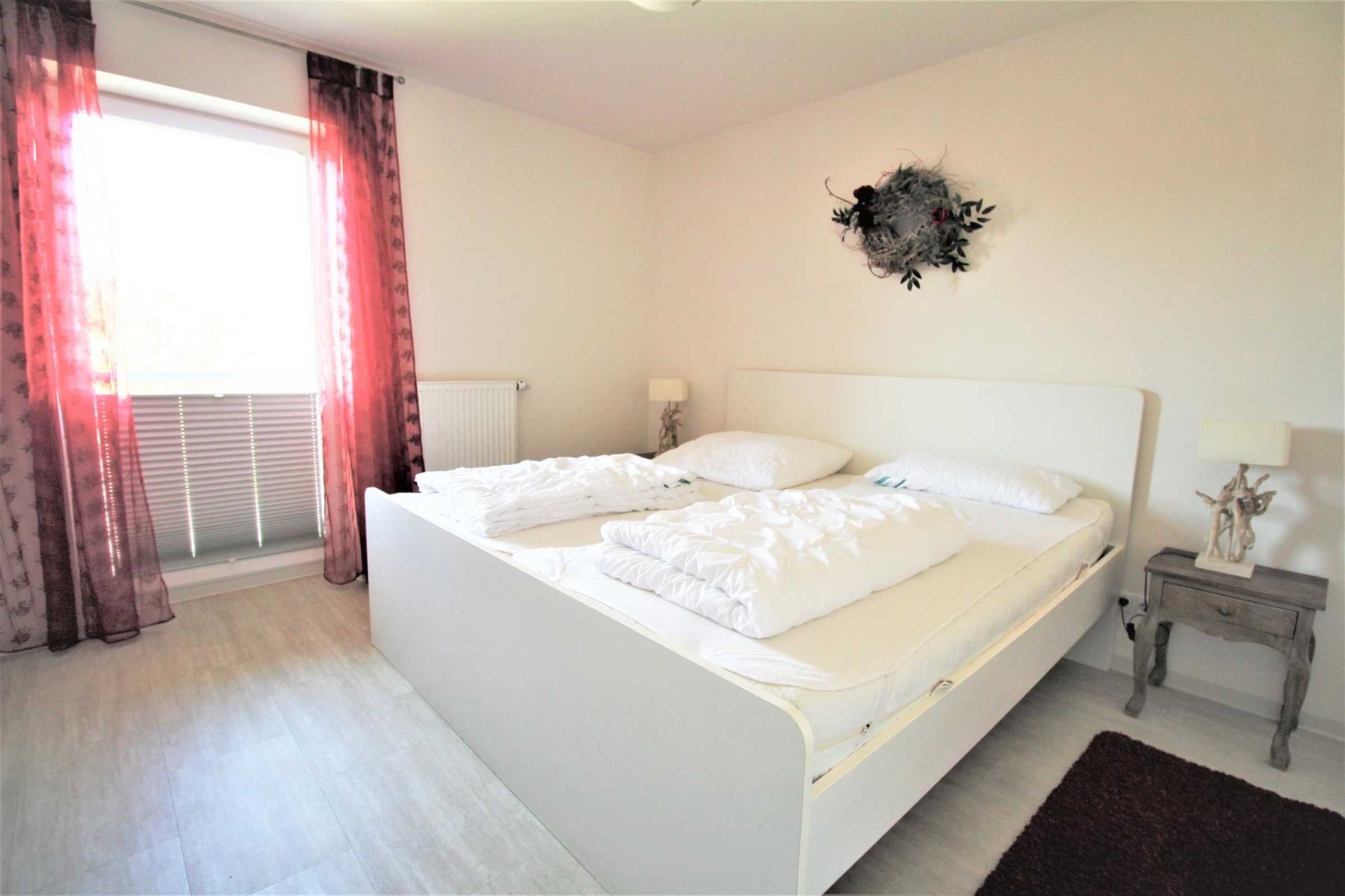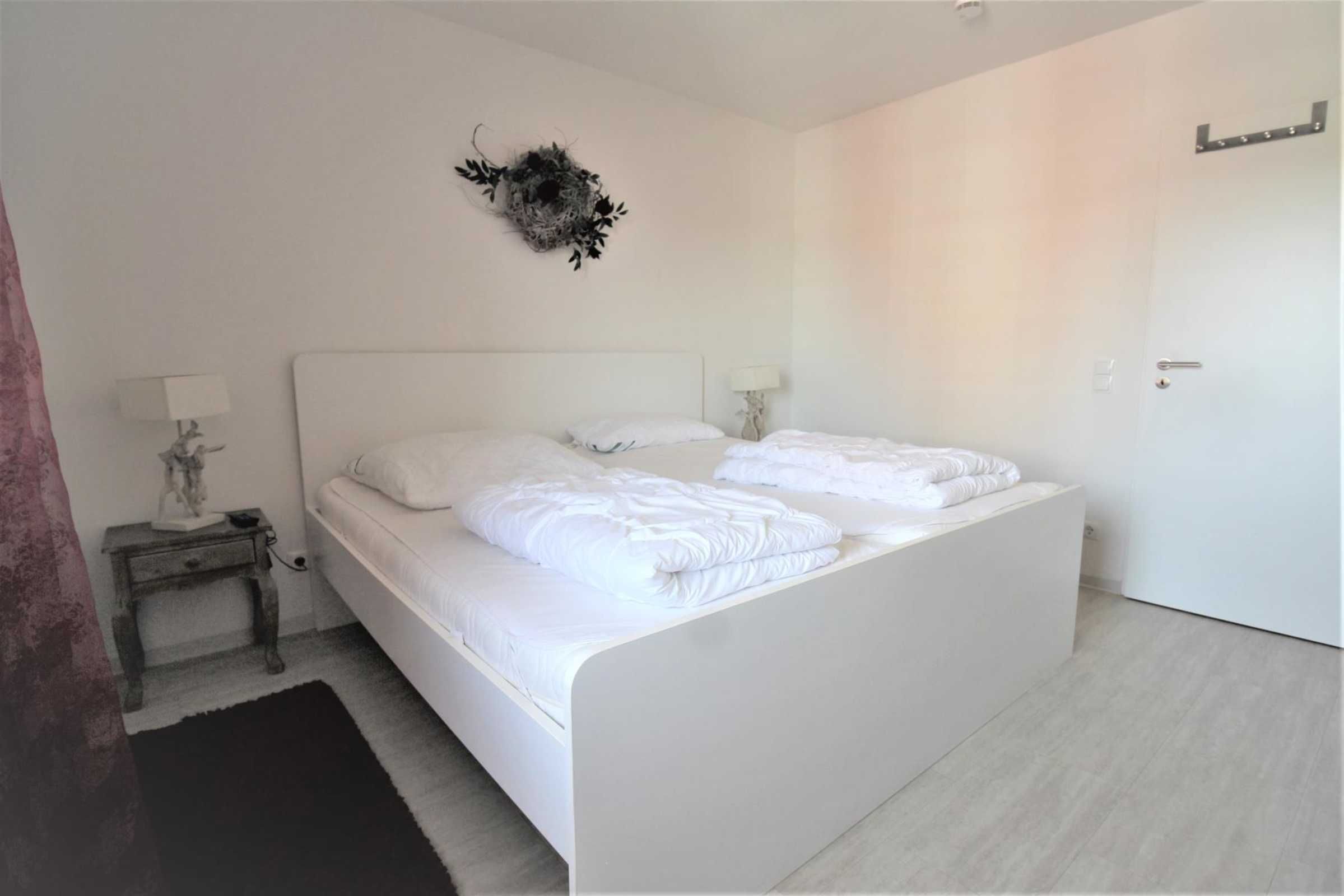 Das Schlafzimmer ist mit einem 200 cm x 200 cm großen Bett ausgestattet, von dem Sie gleich nach dem Aufwachen einen kleinen feinen Blick auf das Wattenmeer genießen. Die Einrichtung ist vom Tischler gefertigt, modern u. romantisch: