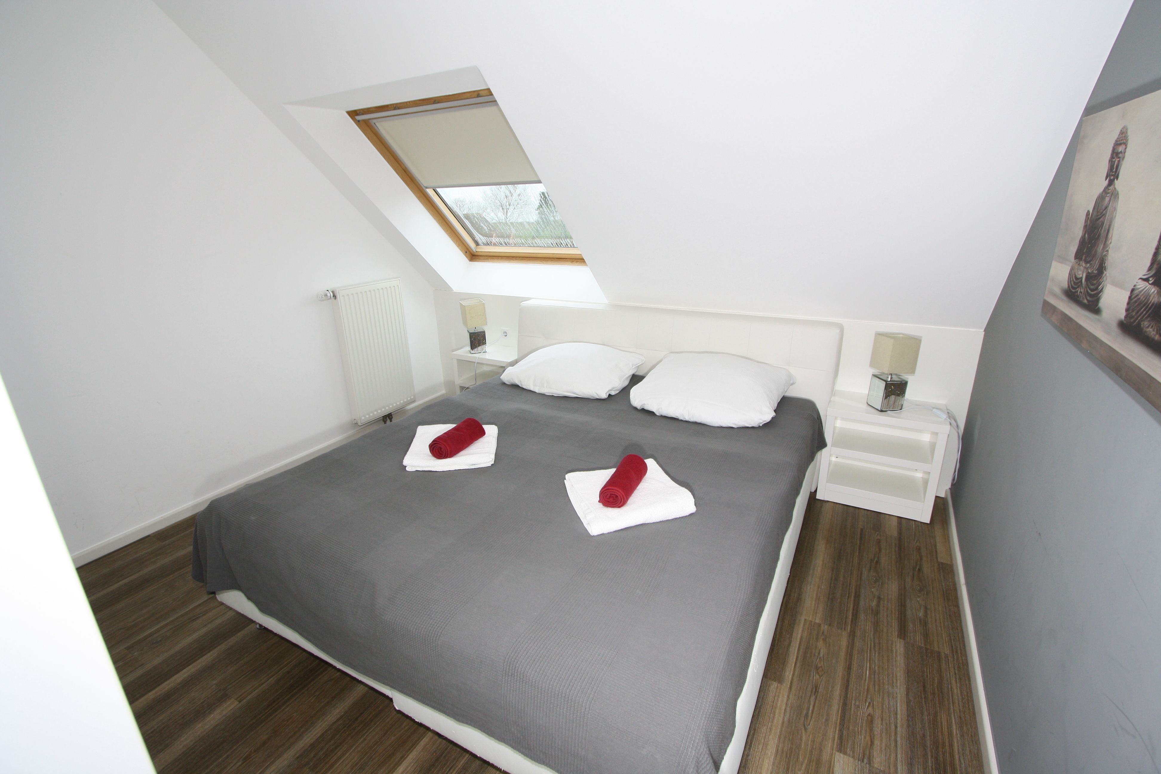 Die Wohnung verfügt über zwei separate Schlafräume auf der Eingangsetage mit jeweils zwei Betten (ein Doppelbett sowie zwei Einzelbetten), eine Schlafcouch im Wohnzimmer bietet zwei weitere Schlafgelegenheiten (Empfehlung: Belegung der Wohnung mit bis zu 4 Personen).
