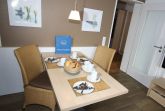 In unserem hellen und modern eingerichteten Wohnzimmer befindet sich ein separater Essplatz für bis zu 4 Personen sowie eine Sitzecke mit bequemer Doppelbettcouch (170 cm x 200 cm Liegefläche).