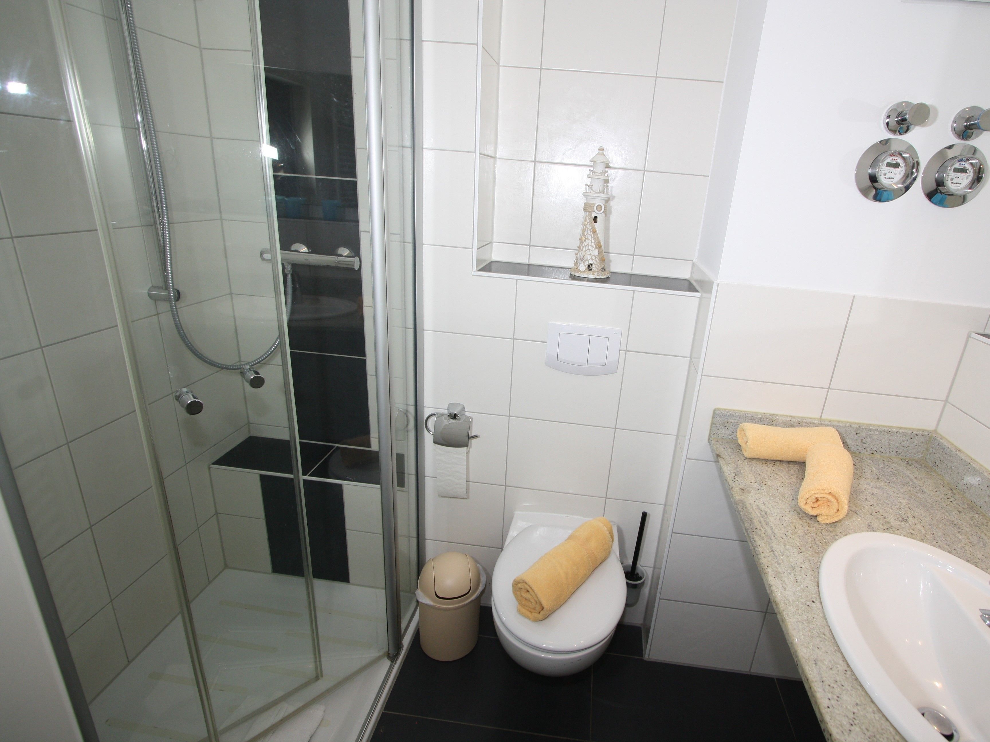 Unser Badezimmer hat eine Dusche mit extra flacher Duschtasse.