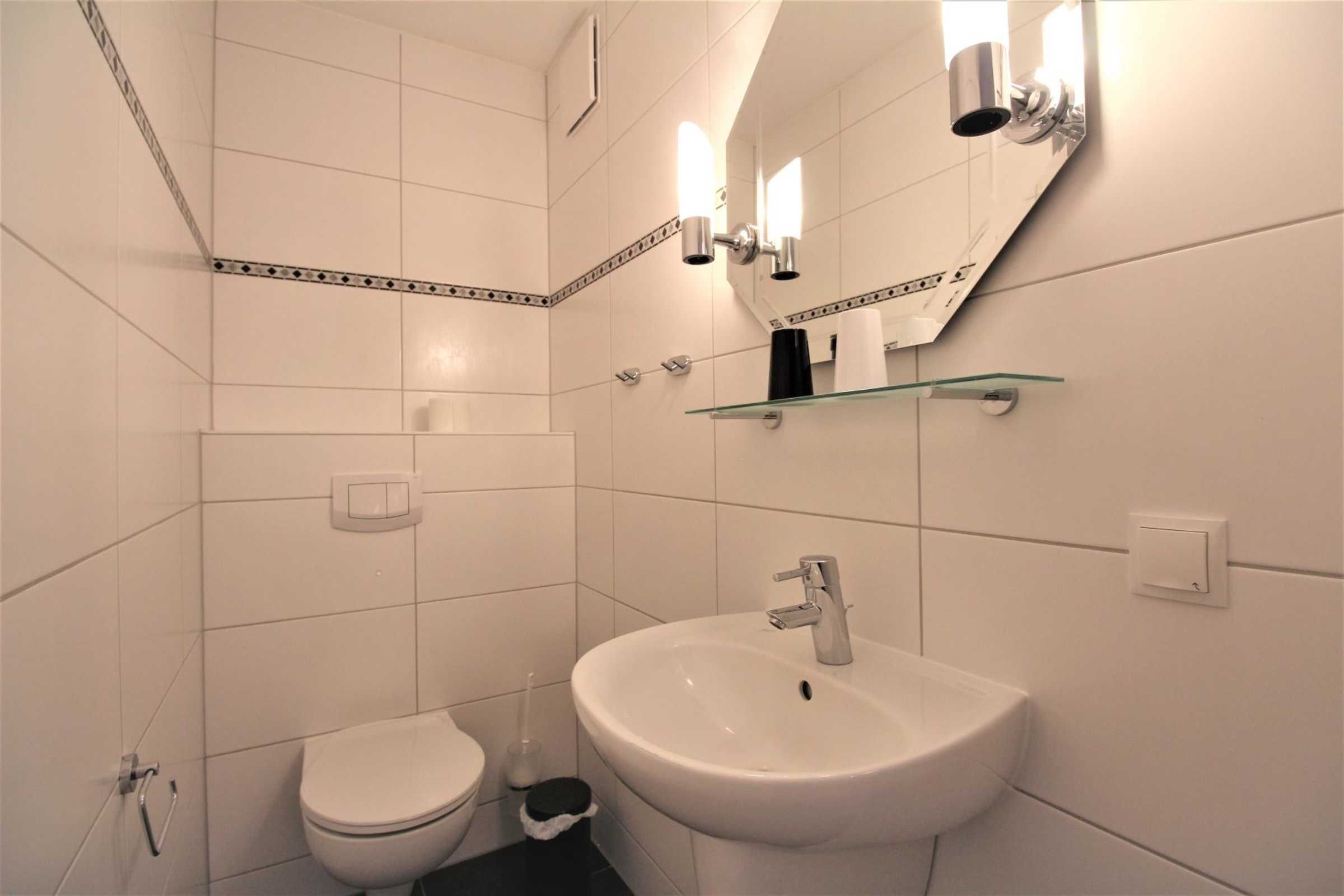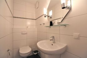 Ein zusätzliches Gäste-WC mit großem Waschbecken ist ebenfalls vorhanden. Im Abstellraum runden Bügeleisen, Bügelbrett und Wäscheständer das Angebot ab.