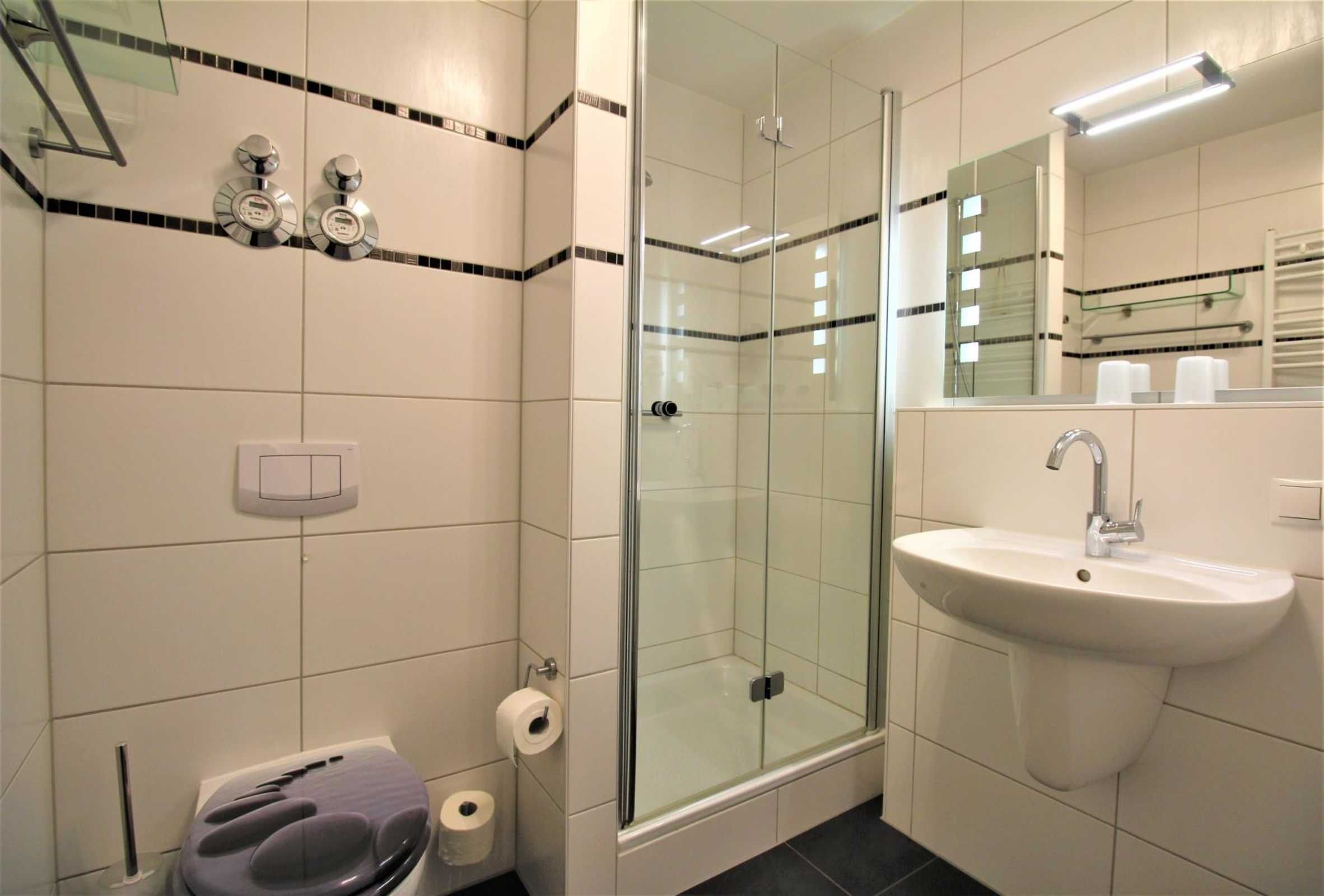 Des Weiteren stehen Ihnen eine Dusche/WC mit Föhn, Kosmetikspiegel und reichlich Ablagefläche zur Verfügung.