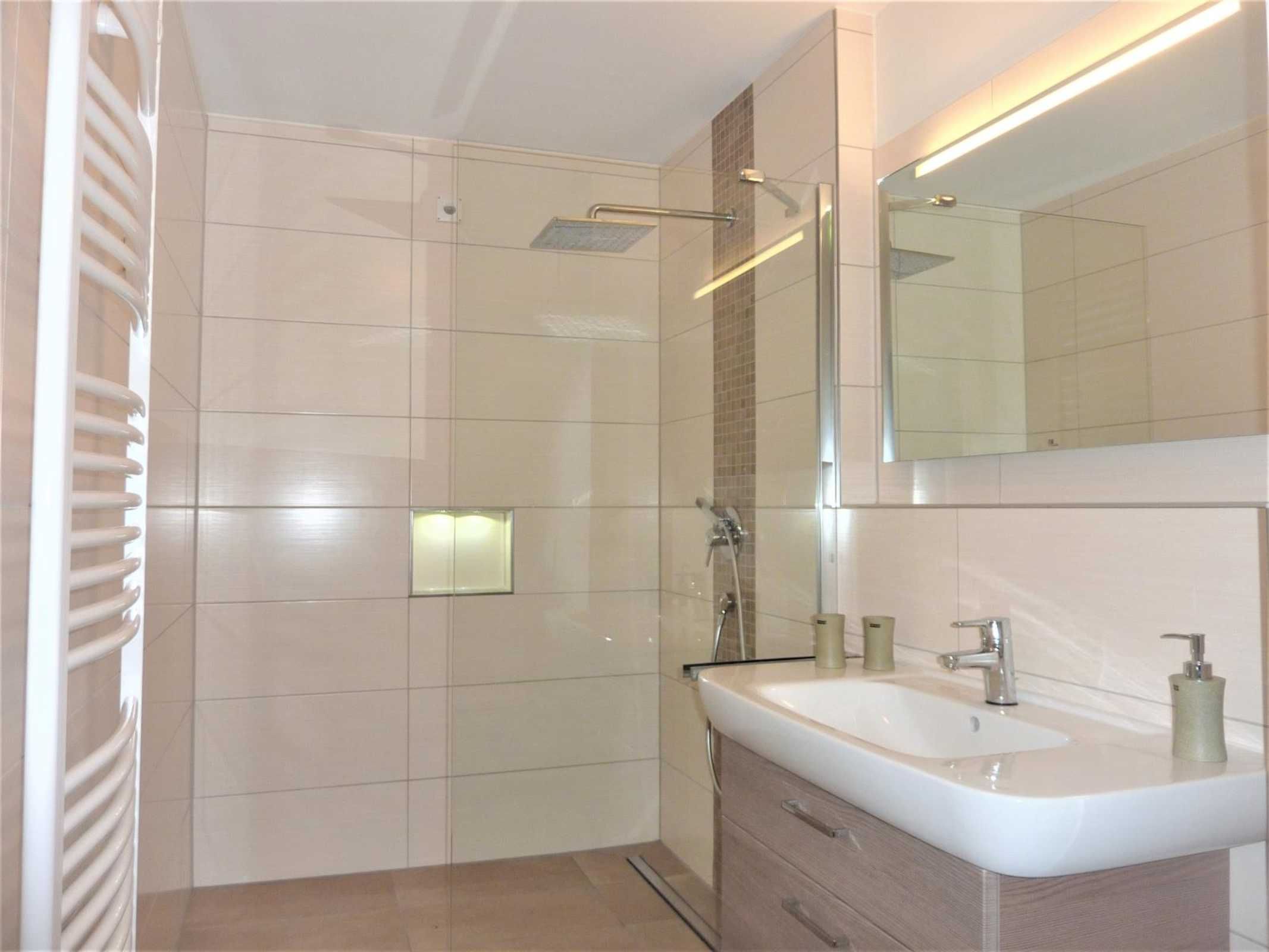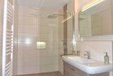 Das luxuriöse Bad verfügt über eine riesige Wellnessdusche (120 cm x 160 cm), Fußbodenheizung und ein integriertes Badezimmerradio.