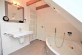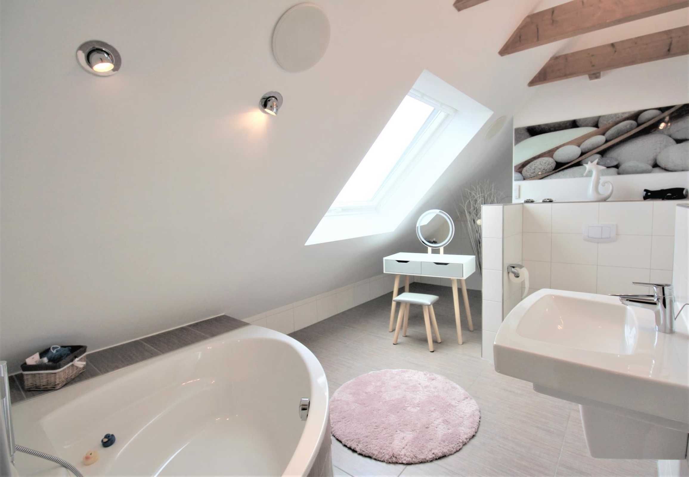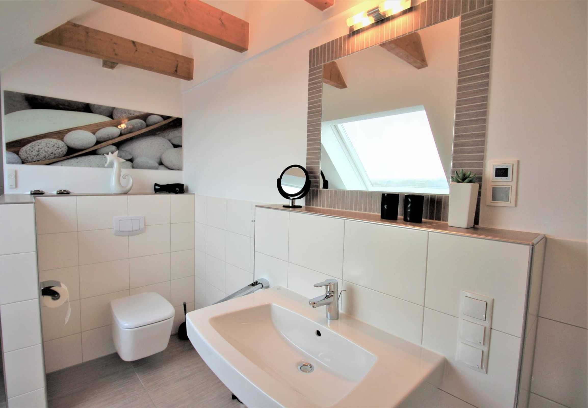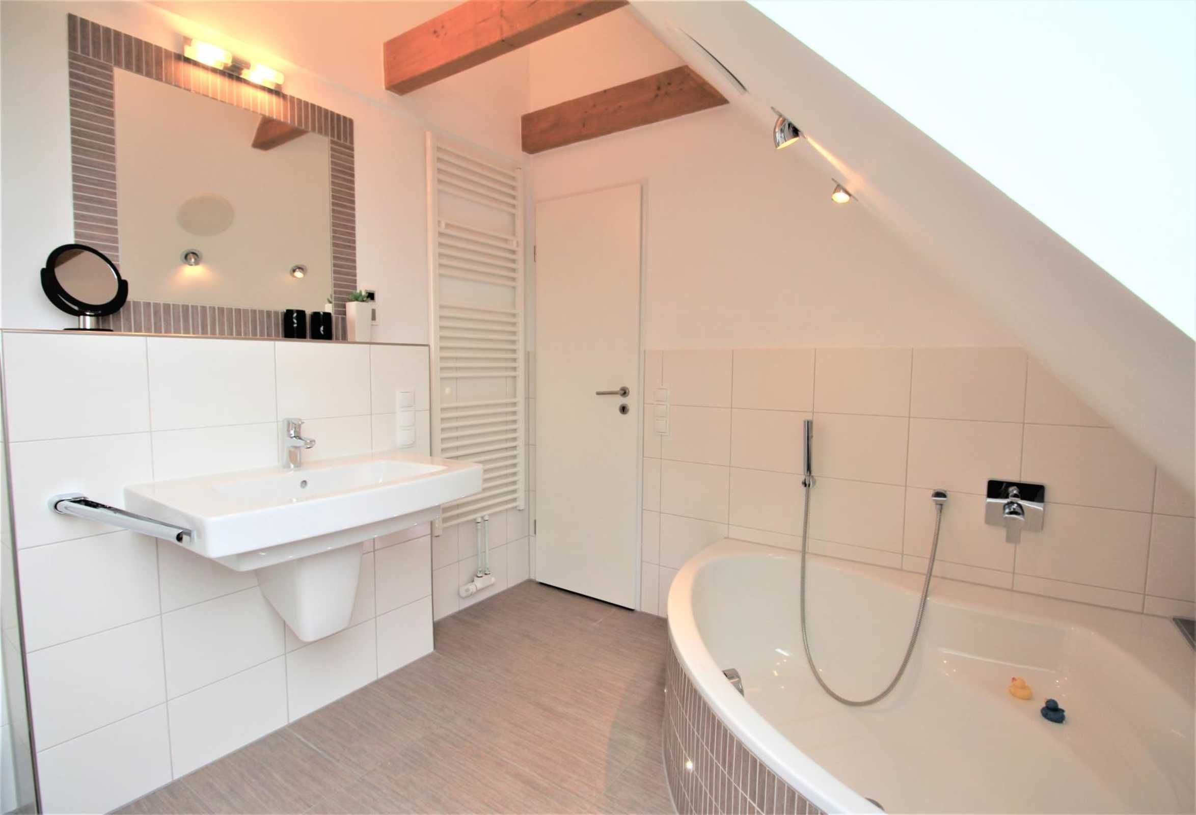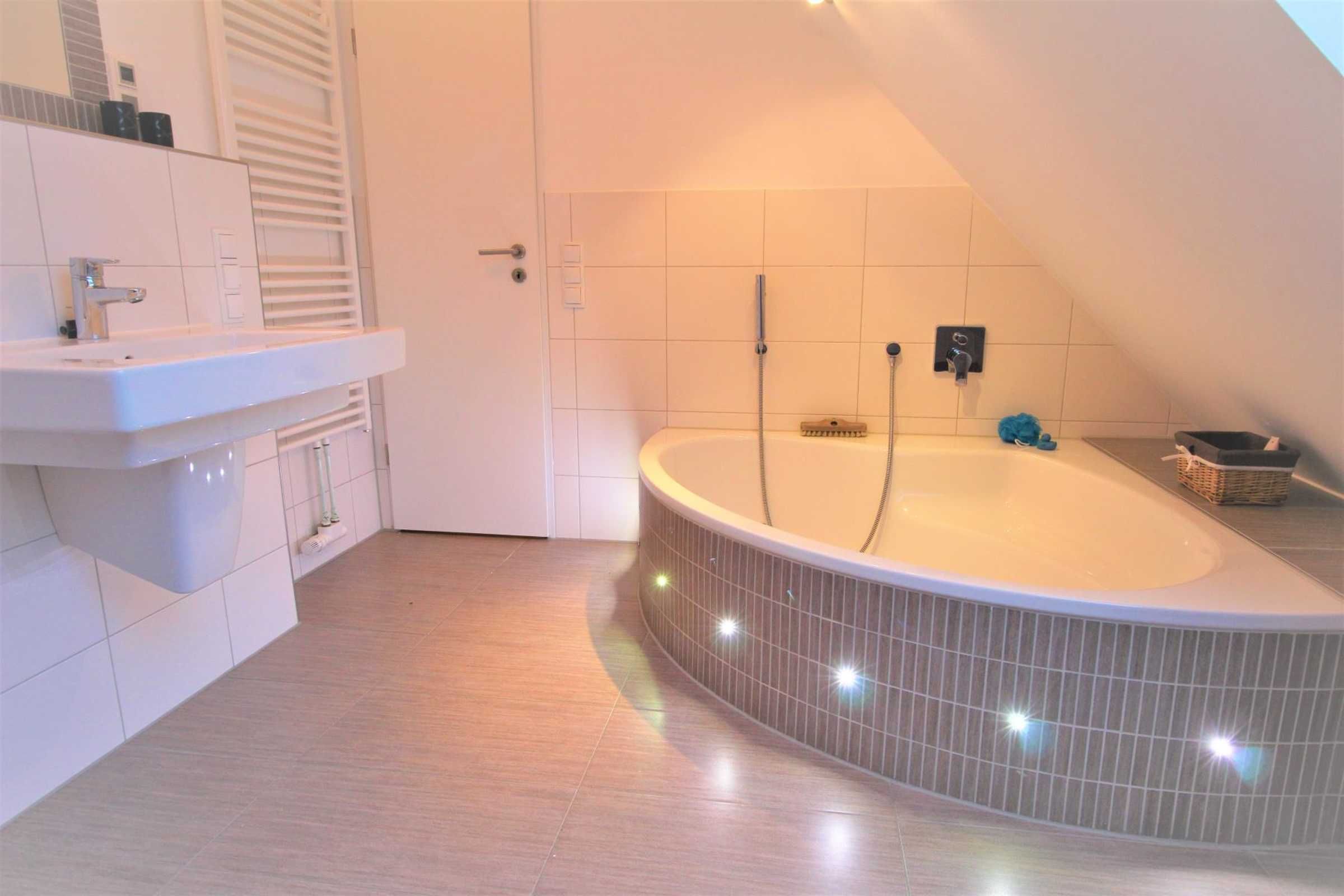 Obere Ebene: Großzügiges Wohlfühlbad mit beleuchteter Eckbadewanne, Kosmetiktisch sowie Föhn sind vorhanden. Optimaler Radioempfang durch große Lautsprecher.