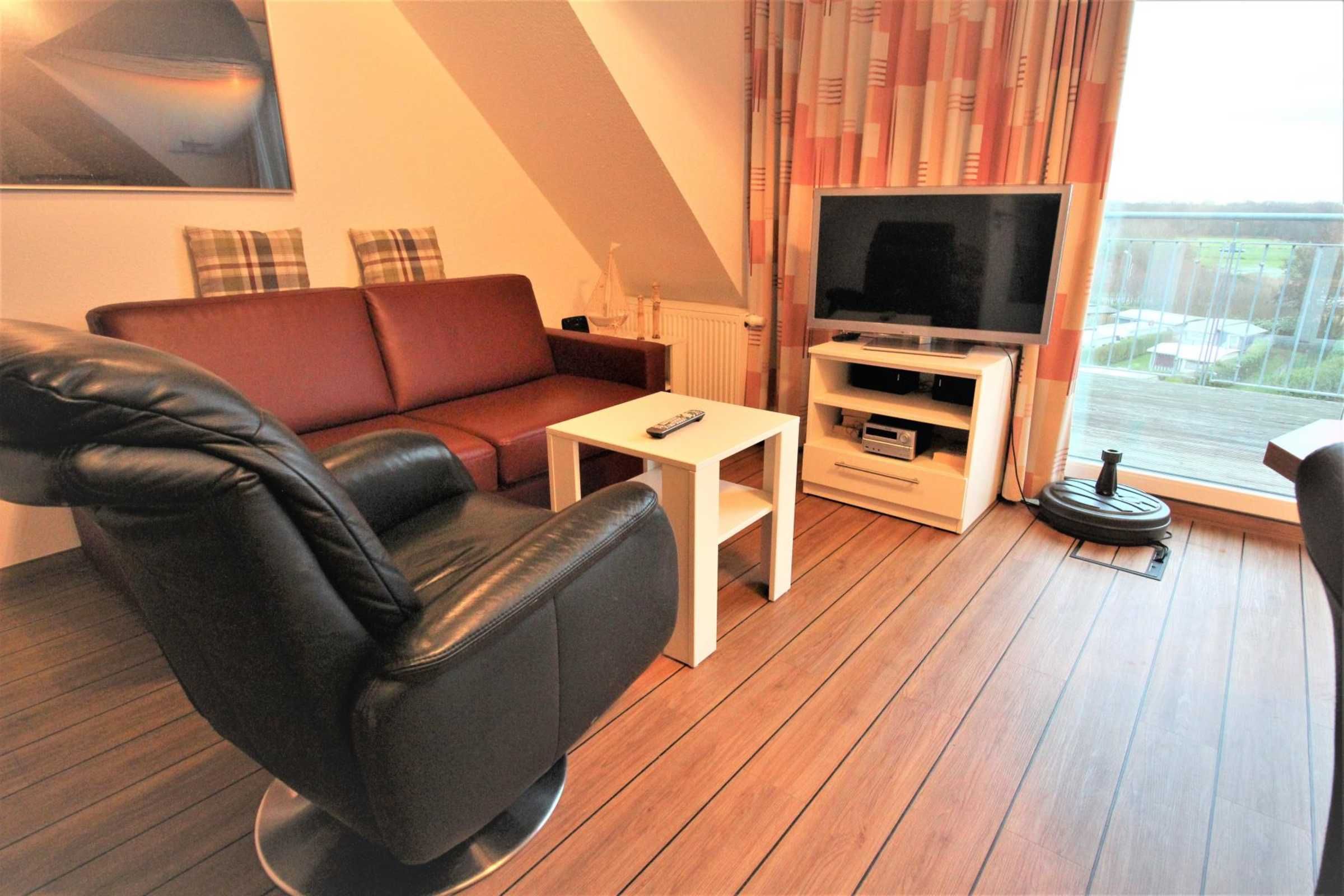 Untere Ebene: Separater Garderobenraum im Eingangsbereich. Gemütlicher und heller Wohnraum mit breiter Fensterfront, Doppelbett-Schlafcouch, Fernsehsessel, Flachbildschirm, Radio und CD-Player.