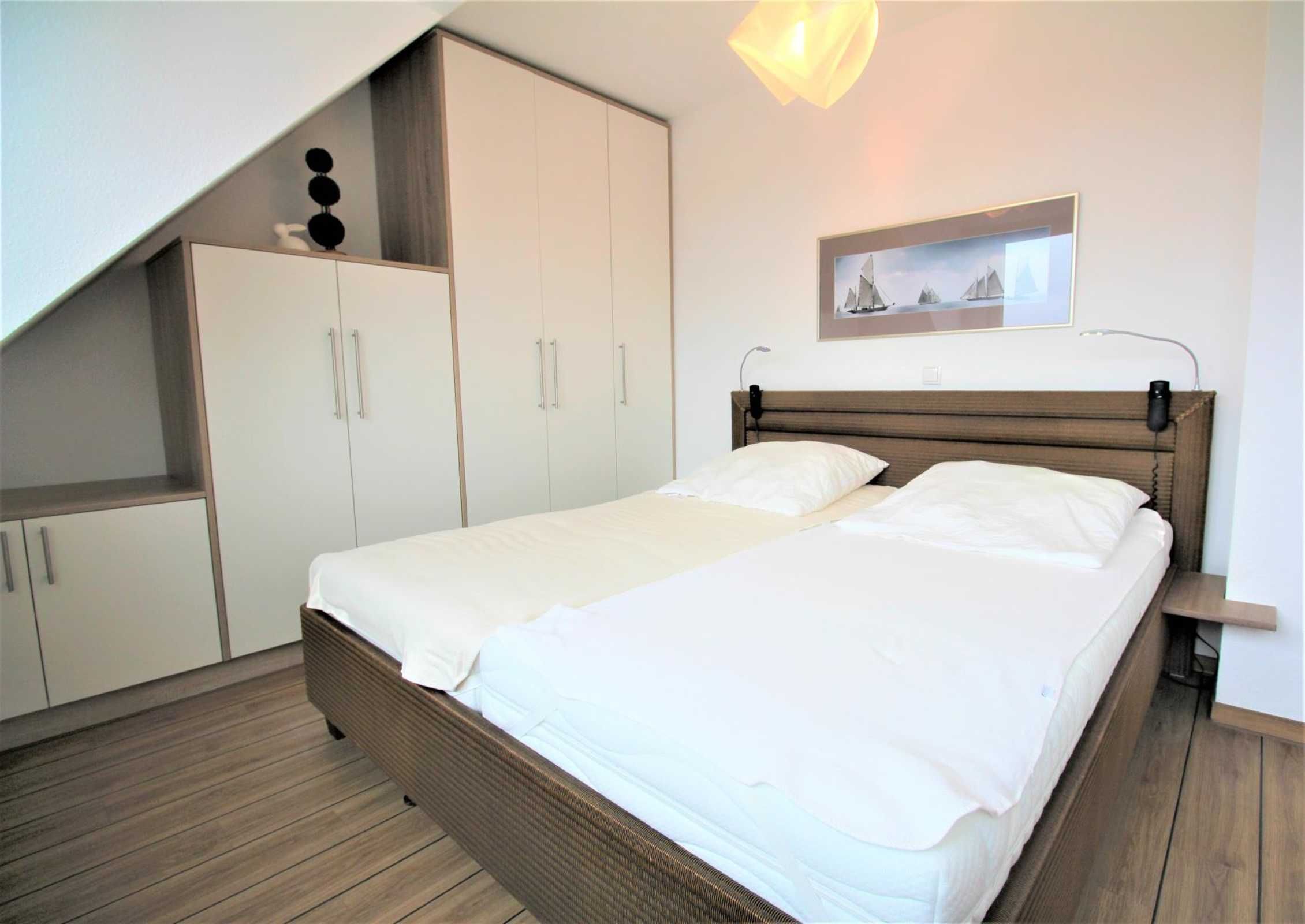 Das Schlafzimmer ist mit einem Doppelbett und Einbauschränken ausgestattet und hat einen direkten Zugang zum Bad mit bodengleicher Dusche (ohne Einstieg).