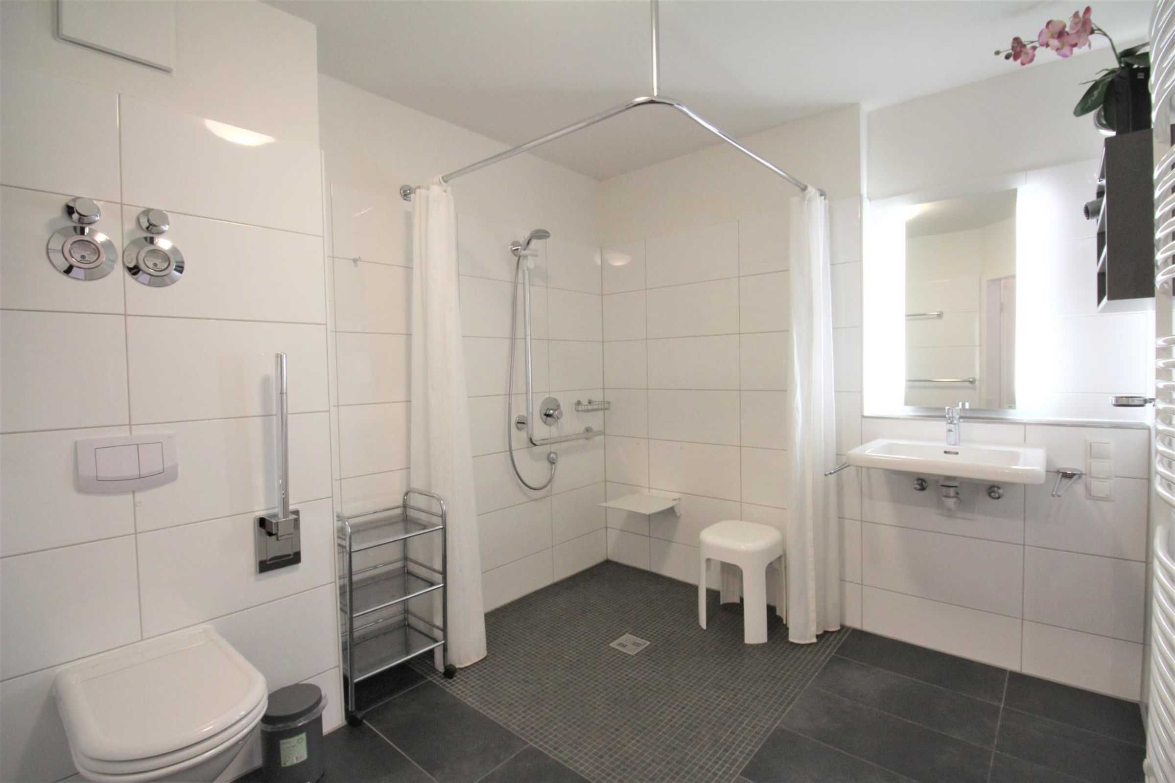 Das große Badezimmer zeichnet sich durch eine ebenerdige Dusche (150 cm x 150 cm) mit Klappsitz (Höhe 50 cm), eine Toilette (Höhe 48 cm) mit Haltegriffen und einen mit dem Rollstuhl unterfahrbaren Waschtisch aus.