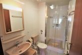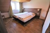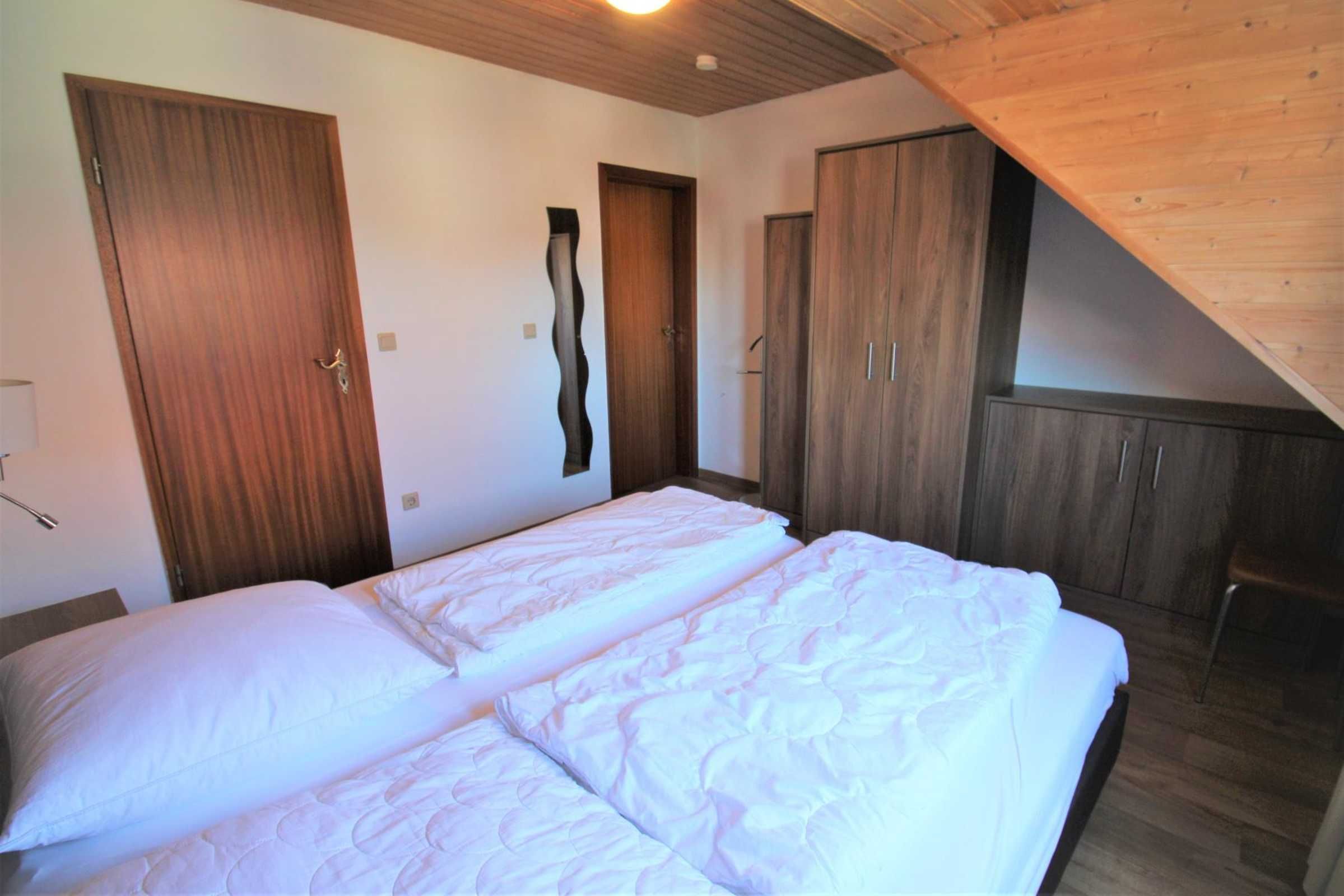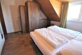 Oben: ein Schlafzimmer mit Doppelbett, Dusche/WC.