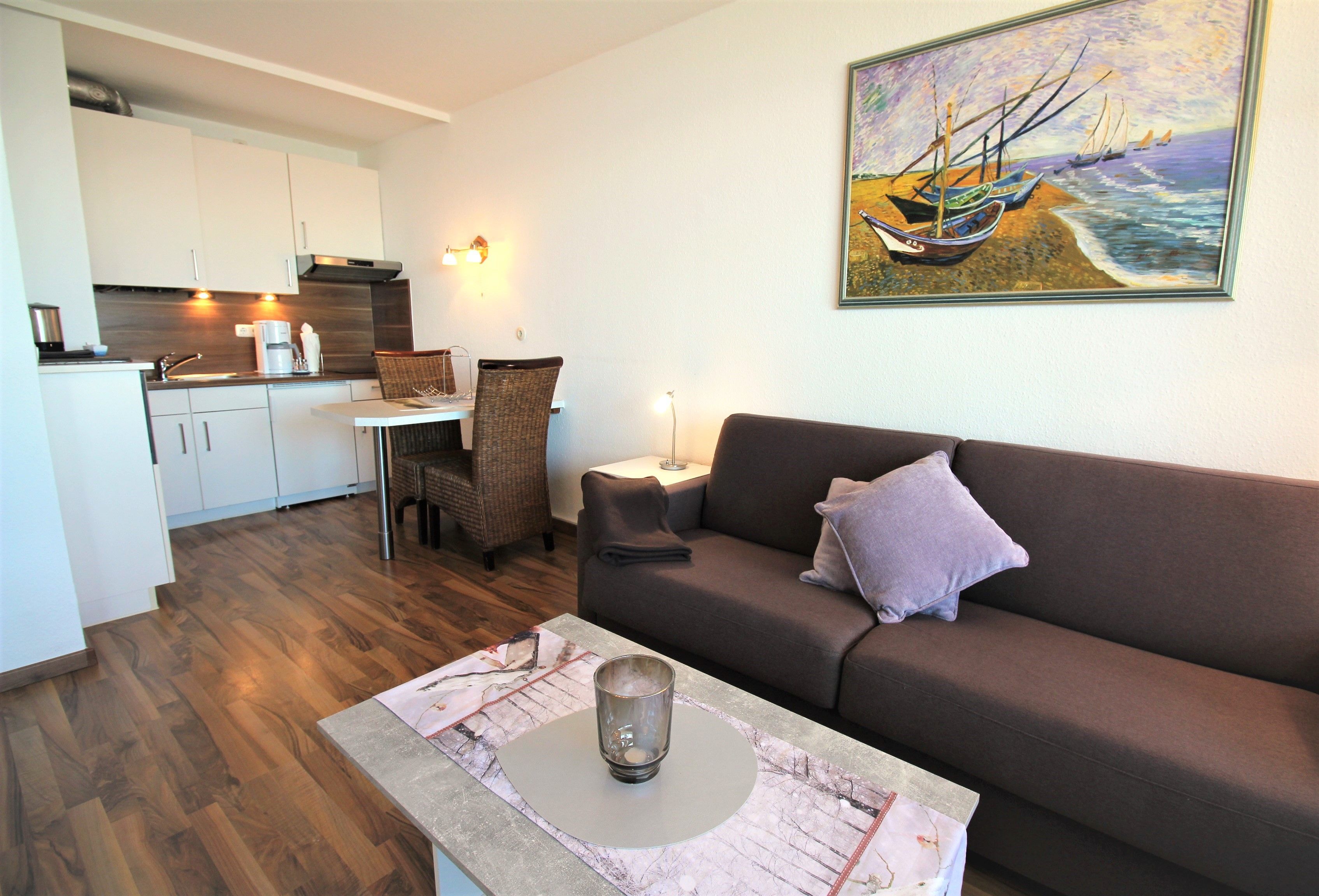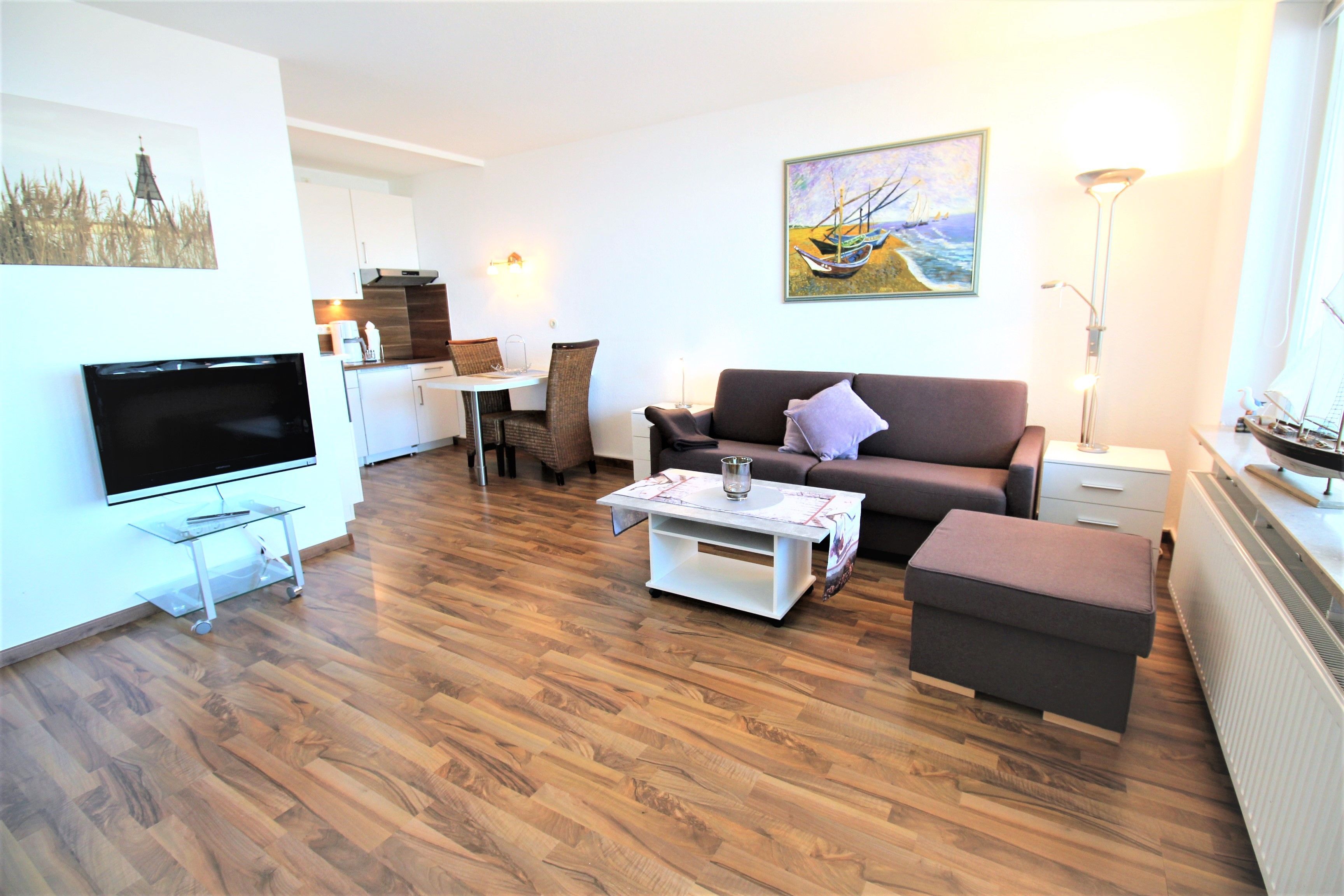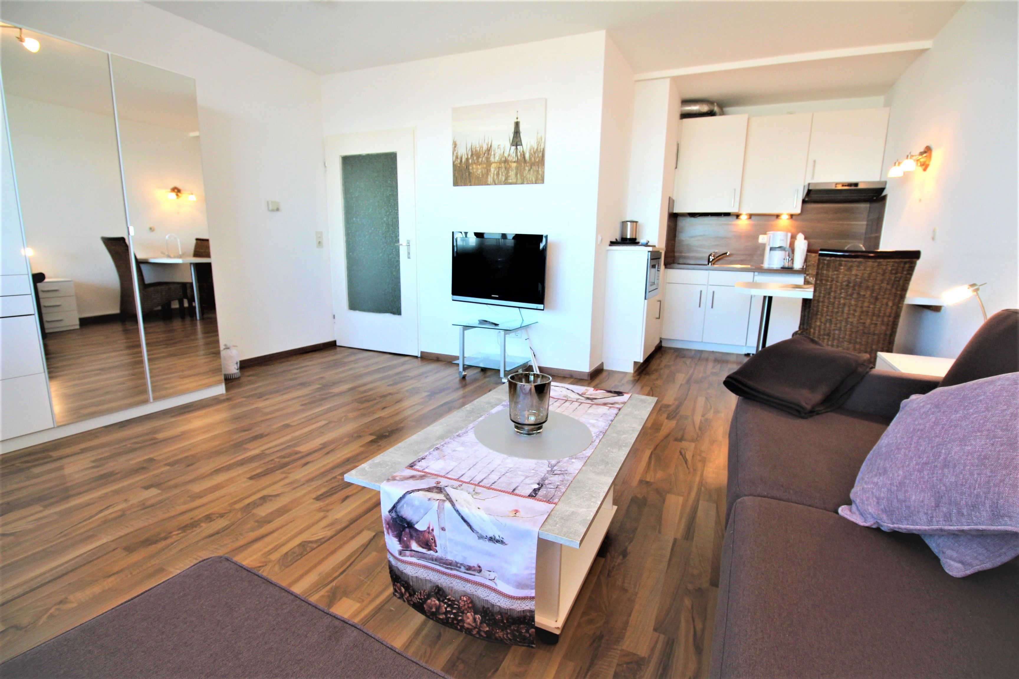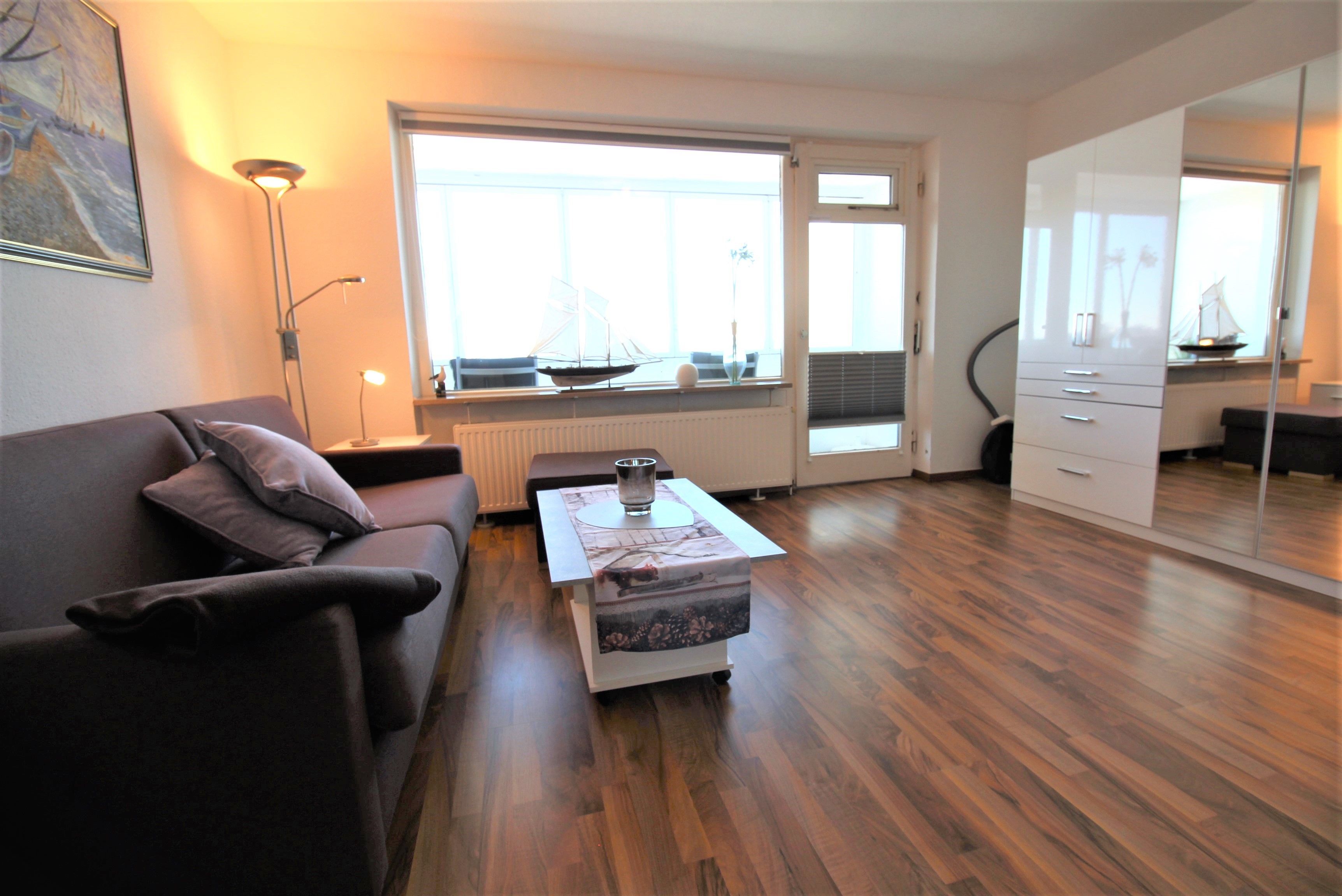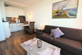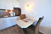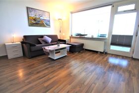 Sie wohnen in einem 1-Zimmer-Appartement für bis zu 2 Personen in der 6. Etage mit Panoramaseesicht auf ca. 35 m² Wohnfläche, ein Wohn-/Schlafraum mit Doppelbettcouch, separater Essplatz, Flachbild-TV, voll ausgestattete Küche mit Mikrowelle, Dusche/WC, verglaster Loggia (Fenster sind zum aufschieben), PKW-Stellplatz und abschließbarer Fahrradgarage.