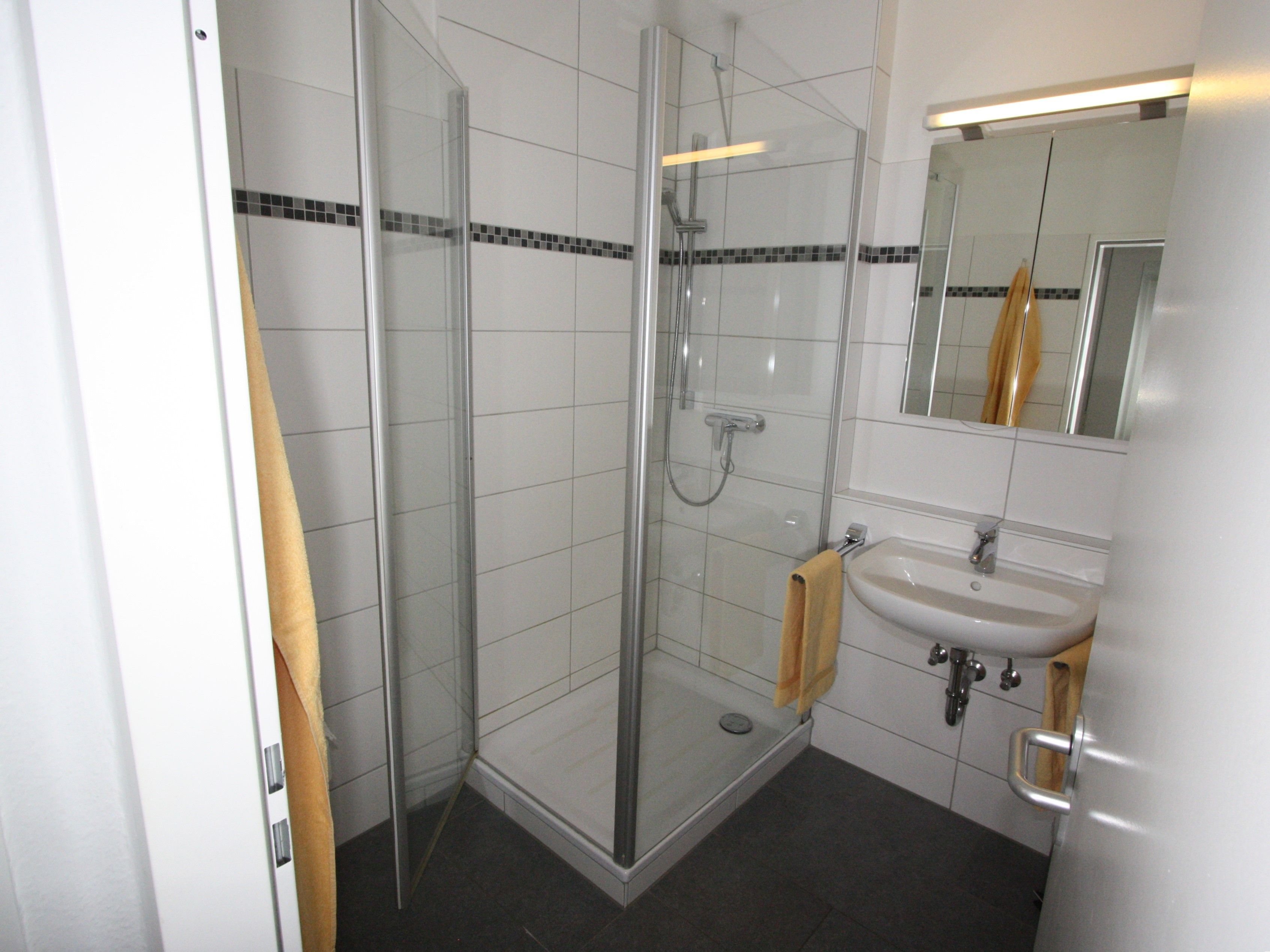 Waschmaschinen und Trockner befinden sich auf der 4. Etage rechts und eine Ladung kostet 3€ und ist mit 6 x 0,50€ zu entrichten.