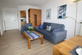 Sie wohnen in einem 2-Zimmer-Appartement für bis zu 4 Personen auf 55 m² Wohnfläche im Erd- und Souterraingeschoss. Die Ferienwohnung verfügt im Erdgeschoss über einen Wohn-Schlafraum mit bequemer Doppelbettcouch, Dusche/WC, separate voll ausgestattete Küche ohne Backofen aber mit moderner Mikrowelle, separater Essplatz, Flachbildschirm, SAT-TV, Mini-HiFi-Anlage, großer Balkon (Westseite mit Abendsonne).