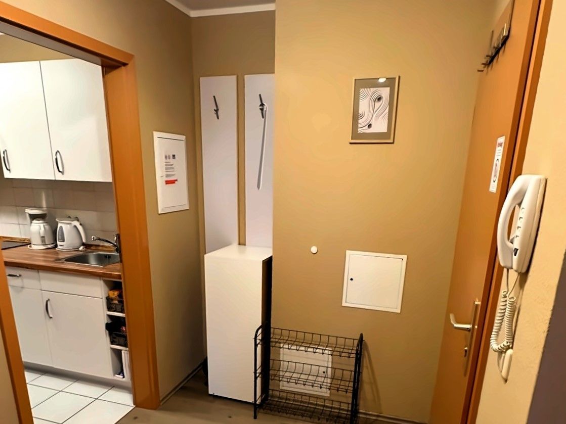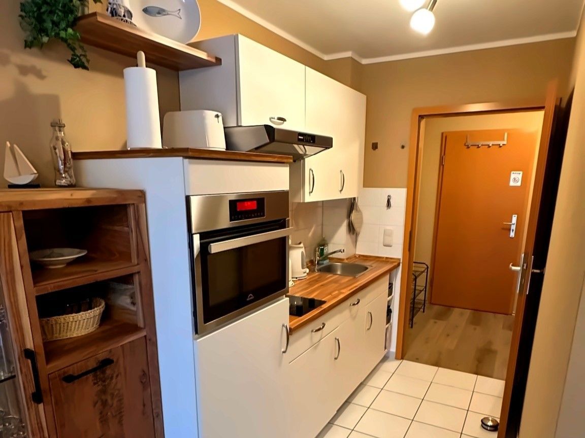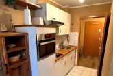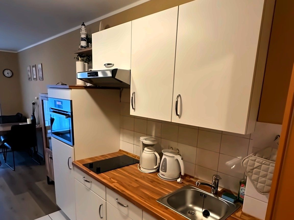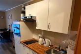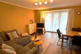 Die Wohnung besteht aus einem geräumigen Wohnzimmer mit einer bequemer Sitzecke im L-Form, modernen Vitrine, einem Esstisch für vier Personen und einem Flachbildfernseher. Die angrenzende Küche ist vollständig ausgestattet und bietet alles, was man zum Kochen und Essen benötigt, einschließlich eines Ceranfeld-Herdes, Backofen/Mikrowelle, Kühlschrank, Geschirrspüler, Toaster, Wasserkocher und Kaffeemaschine.