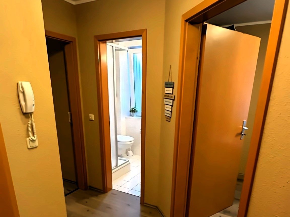 Das Tageslicht-Badezimmer verfügt über eine Dusche, ein WC und ein Waschbecken.