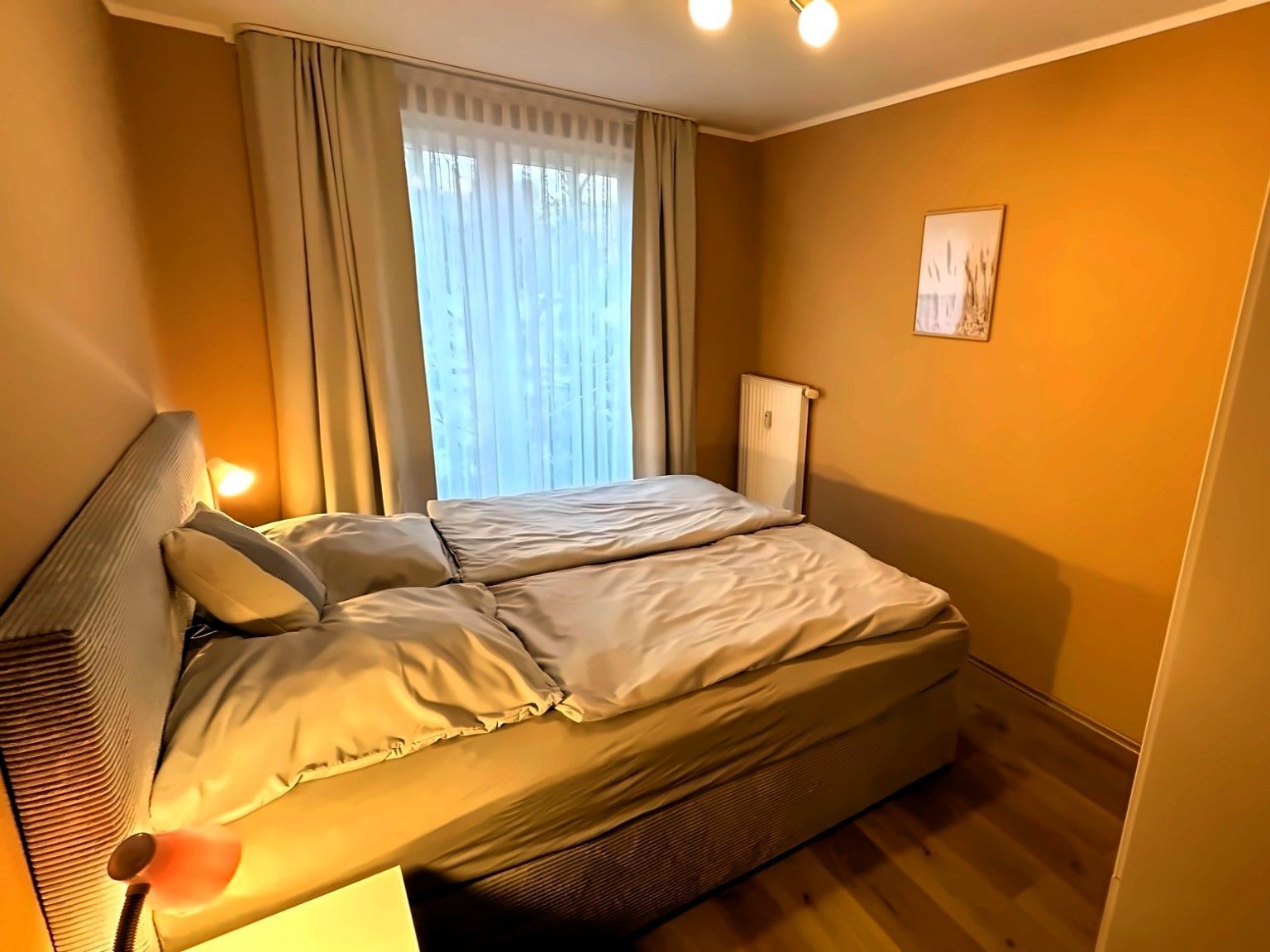 Das Schlafzimmer ist mit einem komfortablen Boxspringbett (180 cm x 200 cm) mit Topper für einen erholsamen Schlaf ausgestattet, sowie einem großen Kleiderschrank.