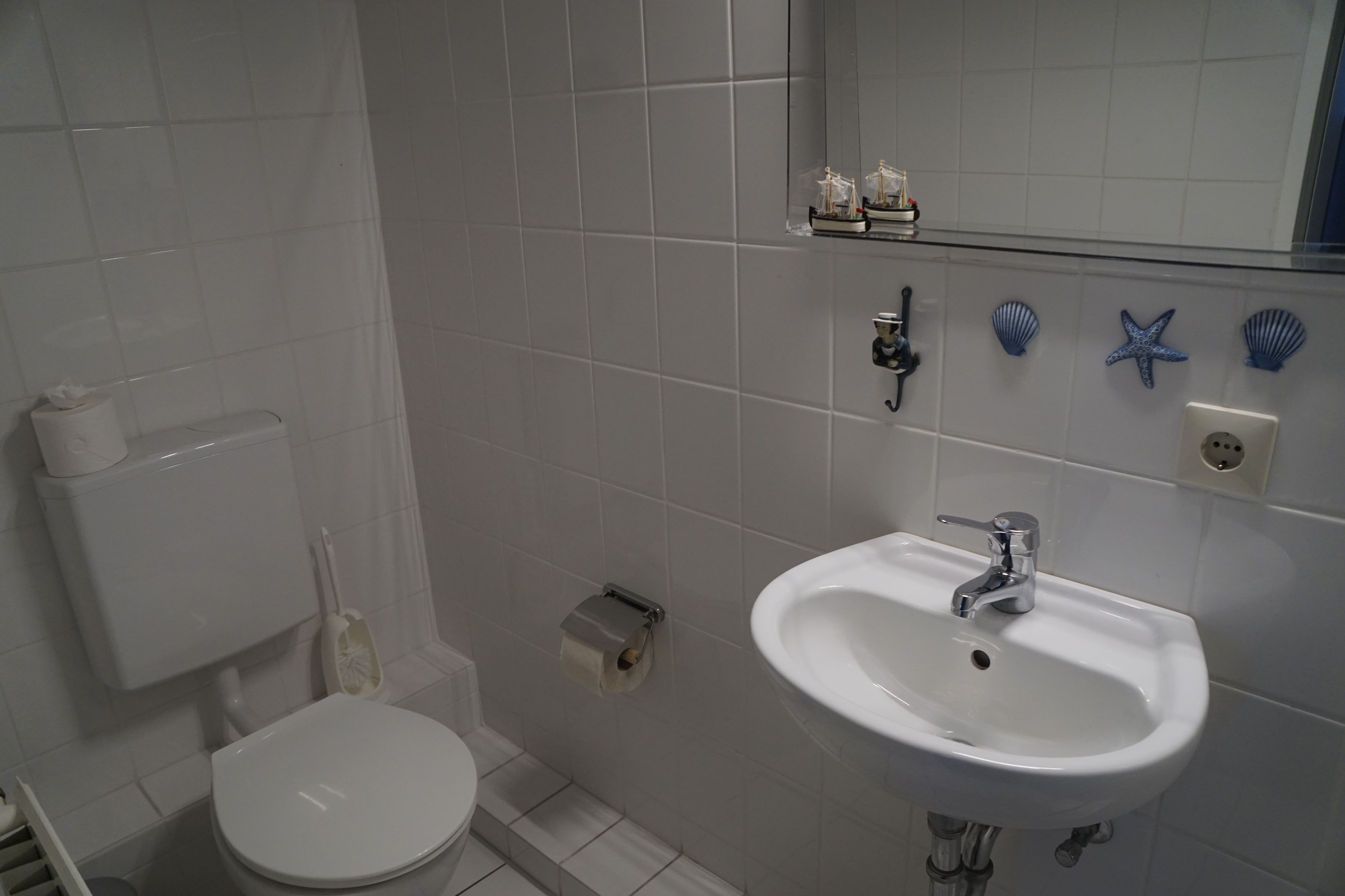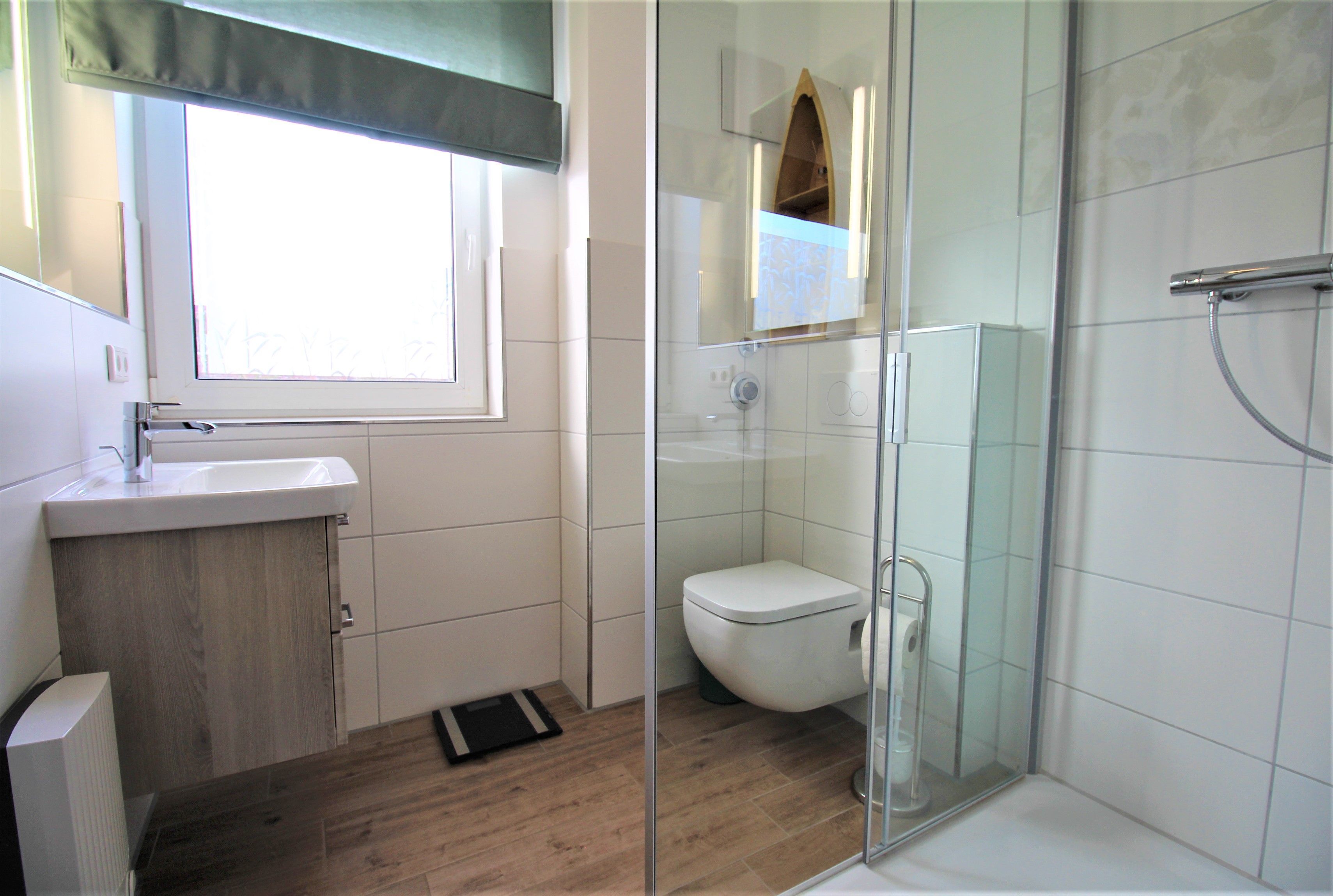 Ein Bad mit Außenfenster, WC und großer Dusche (120 cm x 90 cm), Handtuchheizkörper, ein separates Gäste-WC und ein kleiner Balkon mit Aussicht ins Grüne.