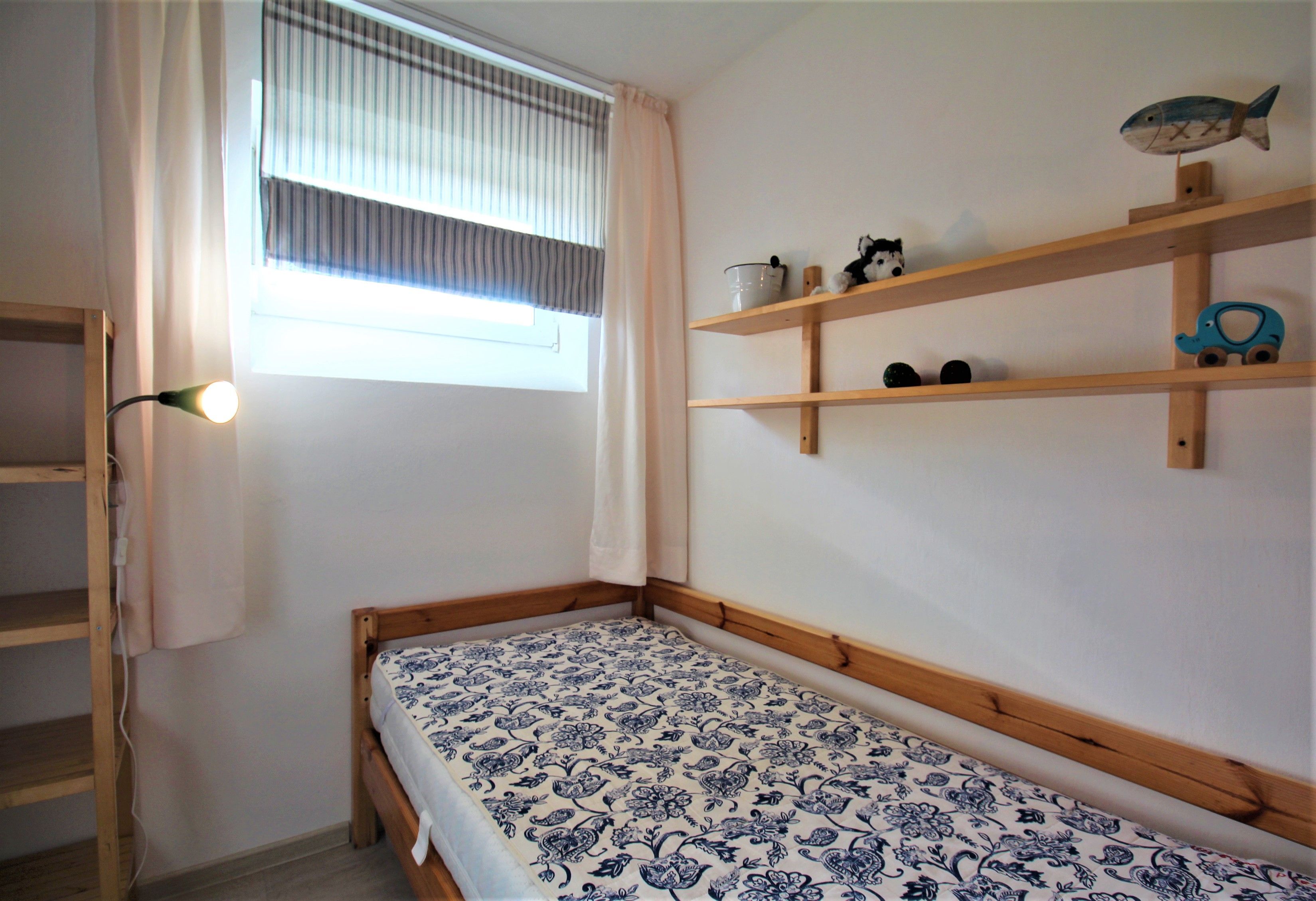 Im Untergeschoss befindet sich ein Schlafzimmer mit Doppelbett und Fernseher und ein Schlafzimmer mit Etagenbett.