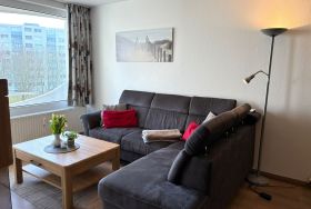 Sie wohnen in einem 1-Zimmer-Appartement für bis zu 4 Personen auf ca. 40 m² im 3. OG mit einem kleinen zusätzlichen Schlafzimmer mit Etagenbett für die 3. und 4. Person. Wohn-/Schlafzimmer mit Doppelbett, separater Essplatz, voll ausgestatteter Küchenbereich mit Geschirrspüler und Mikrowelle, Dusche/WC, möblierter Balkon mit Morgensonne und Blick auf die See, LCD-TV, Tiefgaragenplatz und Fahrradstellplatz in einem abschließbaren Raum.