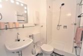 große Dusche mit Duschhocker, Föhn, WC und Handtuchhalter.