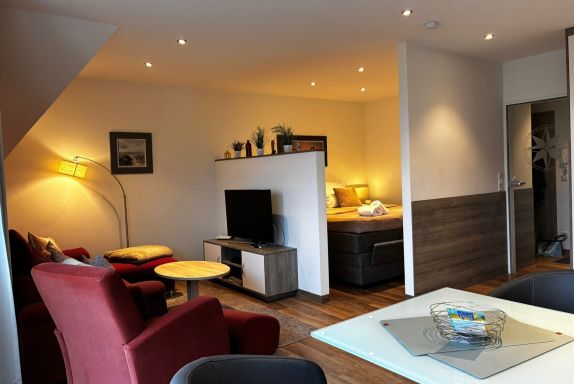1-Zimmer-Appartement für bis zu 2 Personen, ca. 47 m². Wohn-/Schlafraum mit Schlafnische / Raumteiler und Doppelbett, separater Essplatz und voll ausgestatteter Küchenbereich mit Geschirrspüler und Mikrowelle, Dusche / WC, Balkon, Kabel-LED-TV. Blu-ray-Player, PKW-Stellplatz in der Tiefgarage, WLAN-Nutzung, Benutzung des Schwimmbades und der Saunen.
