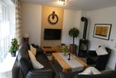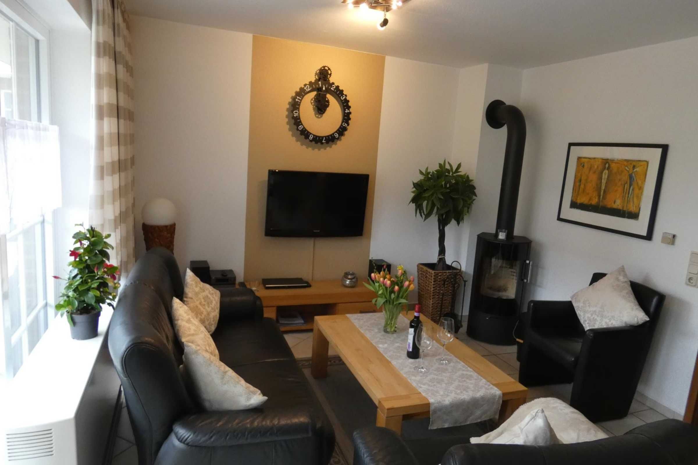 Ein Kaminofen schmückt den ausgesprochen apart und gemütlich eingerichteten Wohnraum mit Flachbildschirm, SAT-TV (Videotext), DAB+ Musikanlage mit Bluetooth und USB-Anschluss, Blu-ray-Player, DVD-Player und bequemer schwarzer Leder-Garnitur.