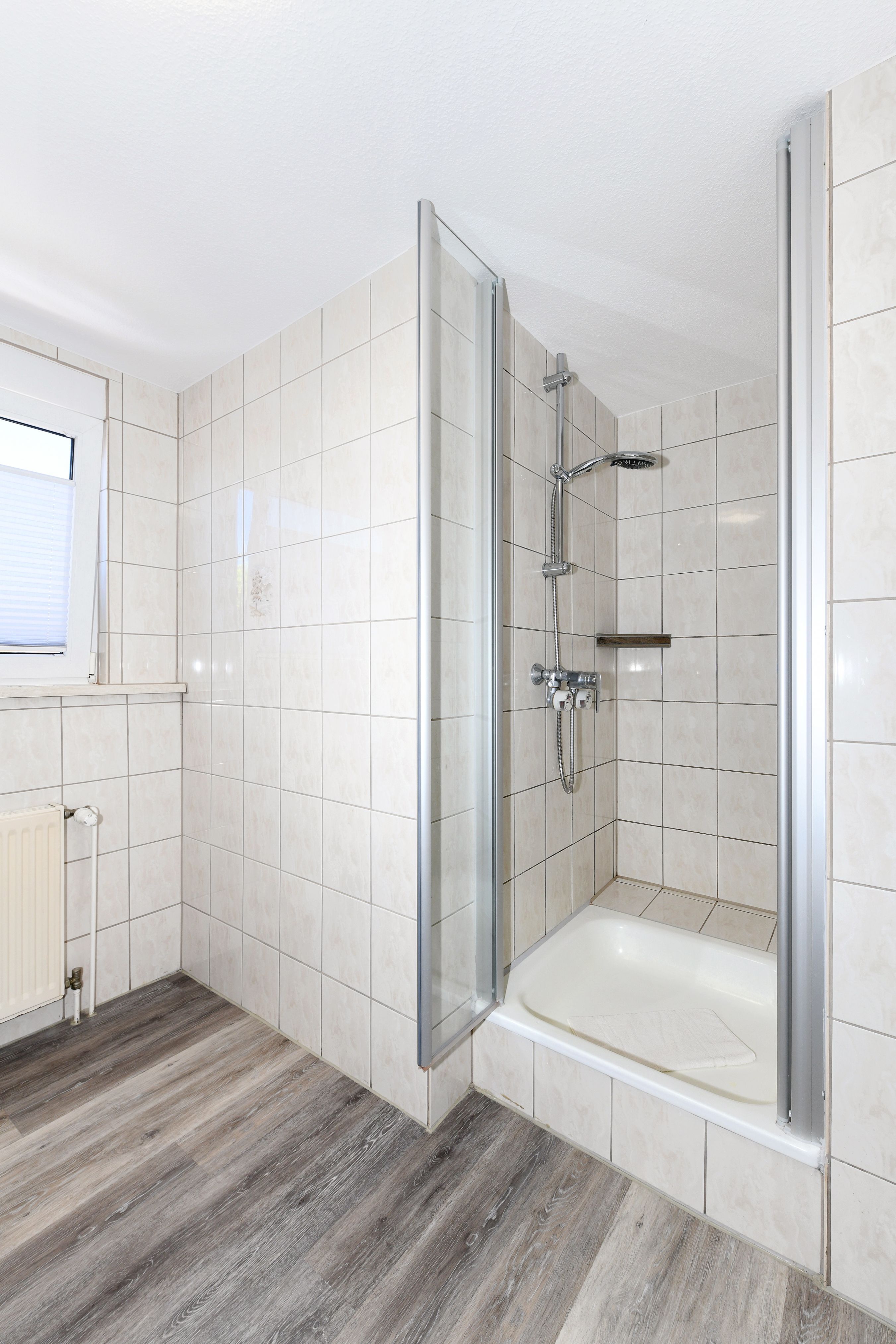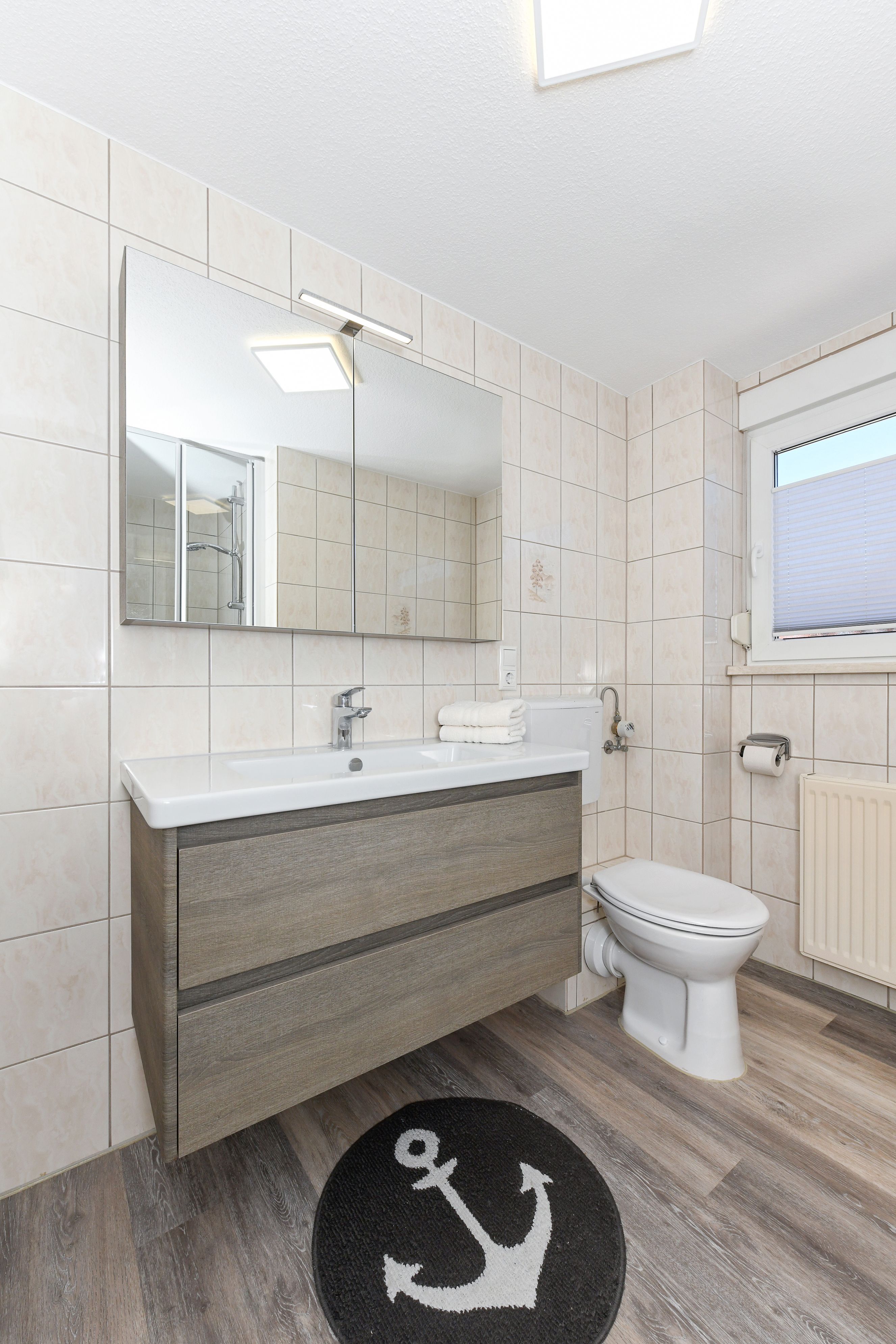 Badezimmer mit Dusche, Waschtisch und WC