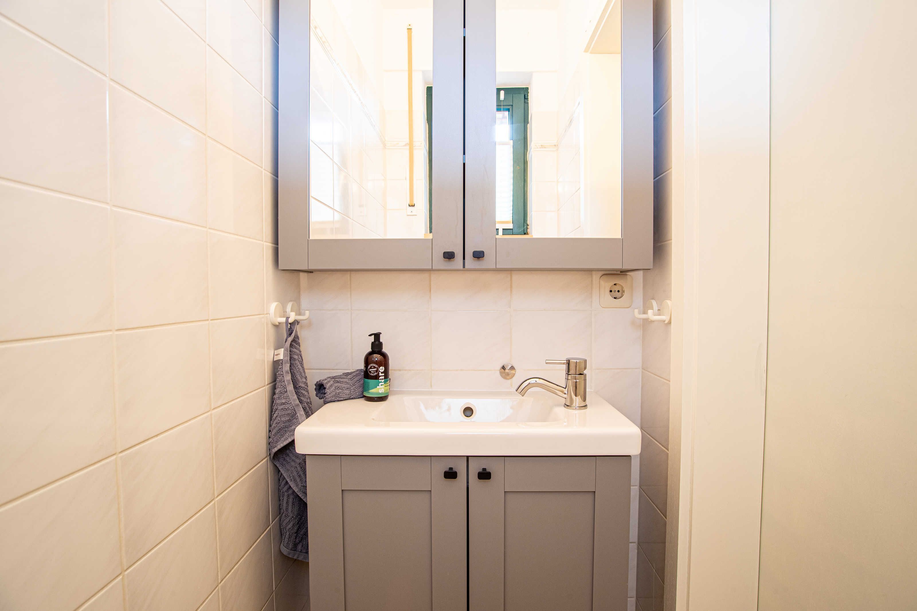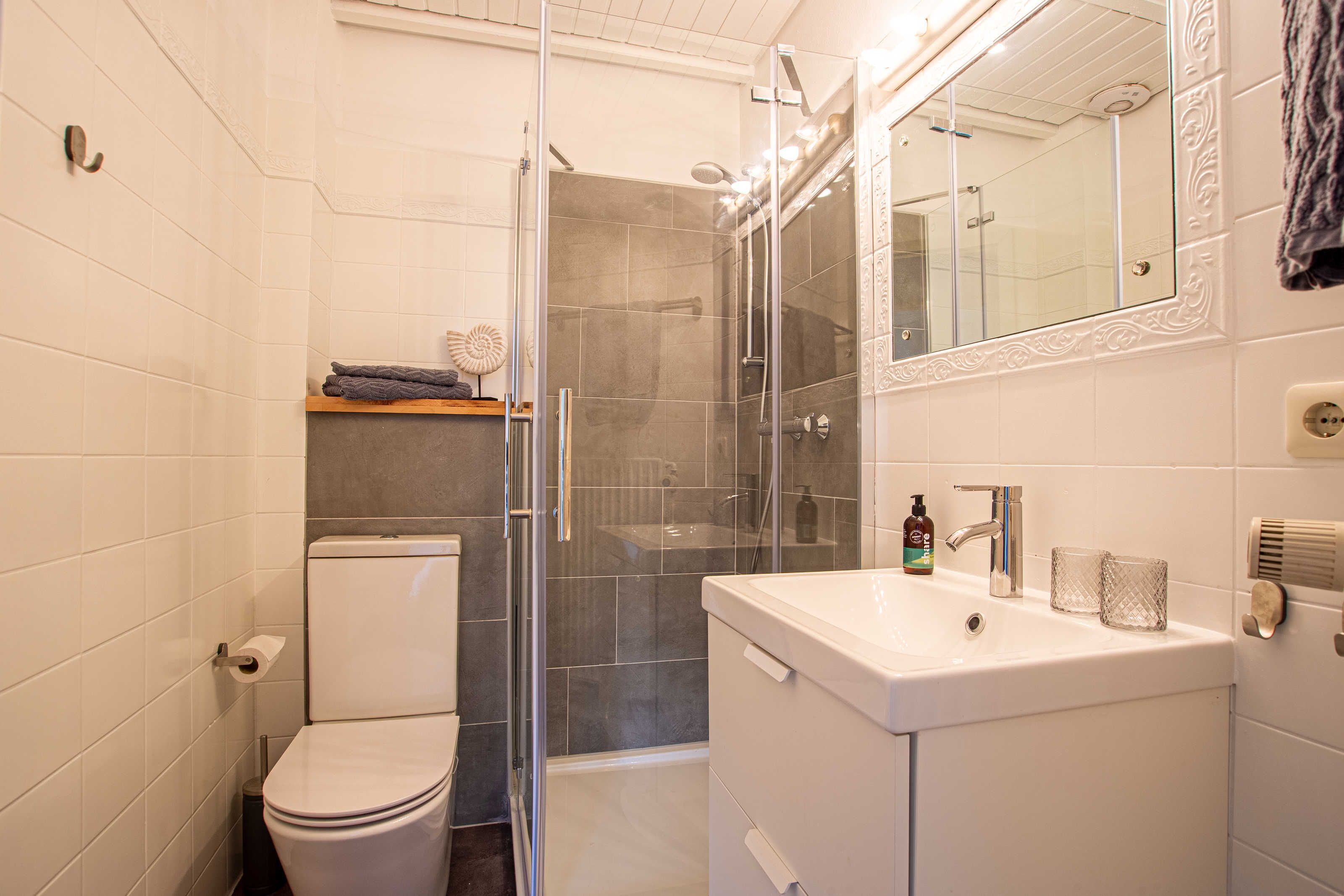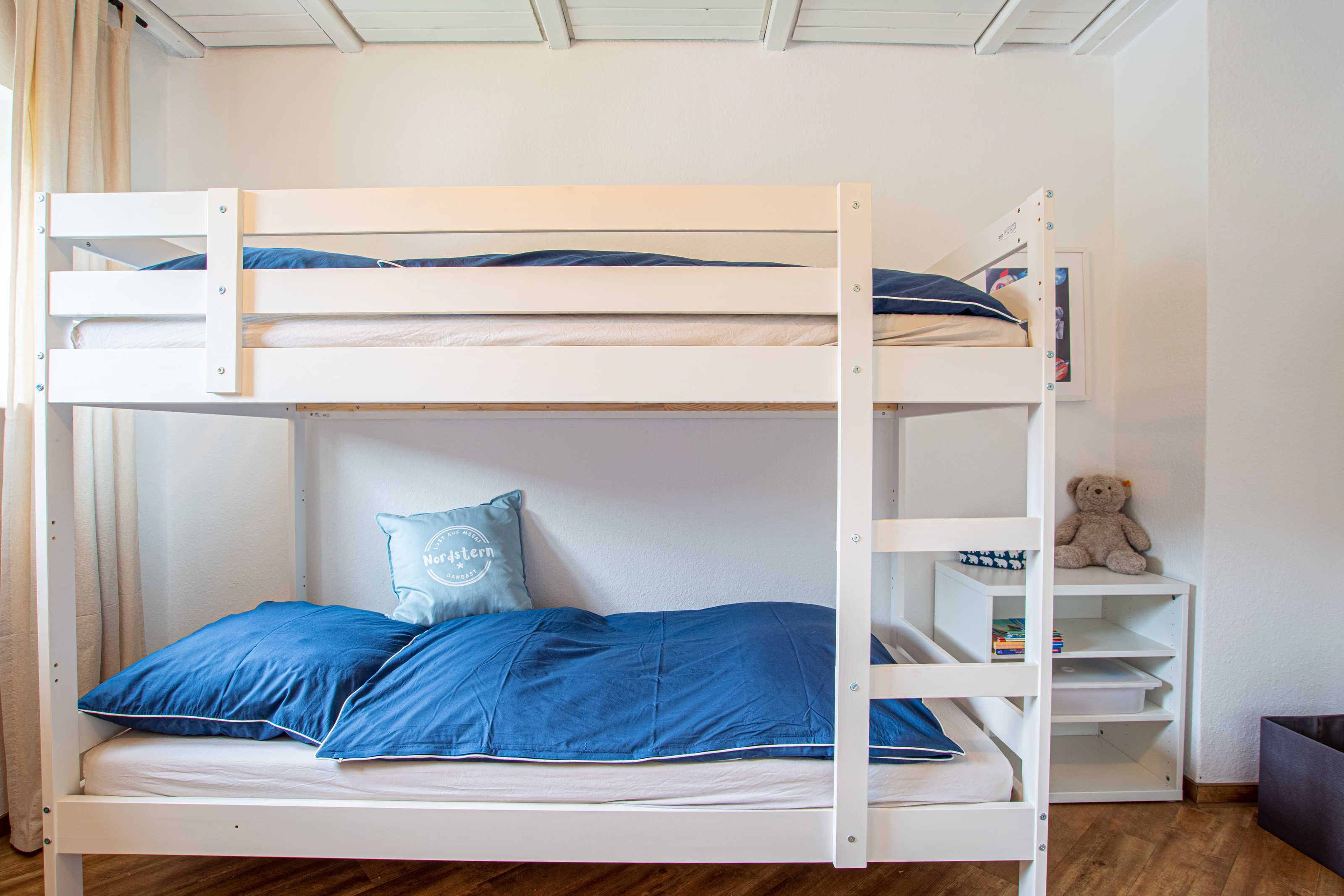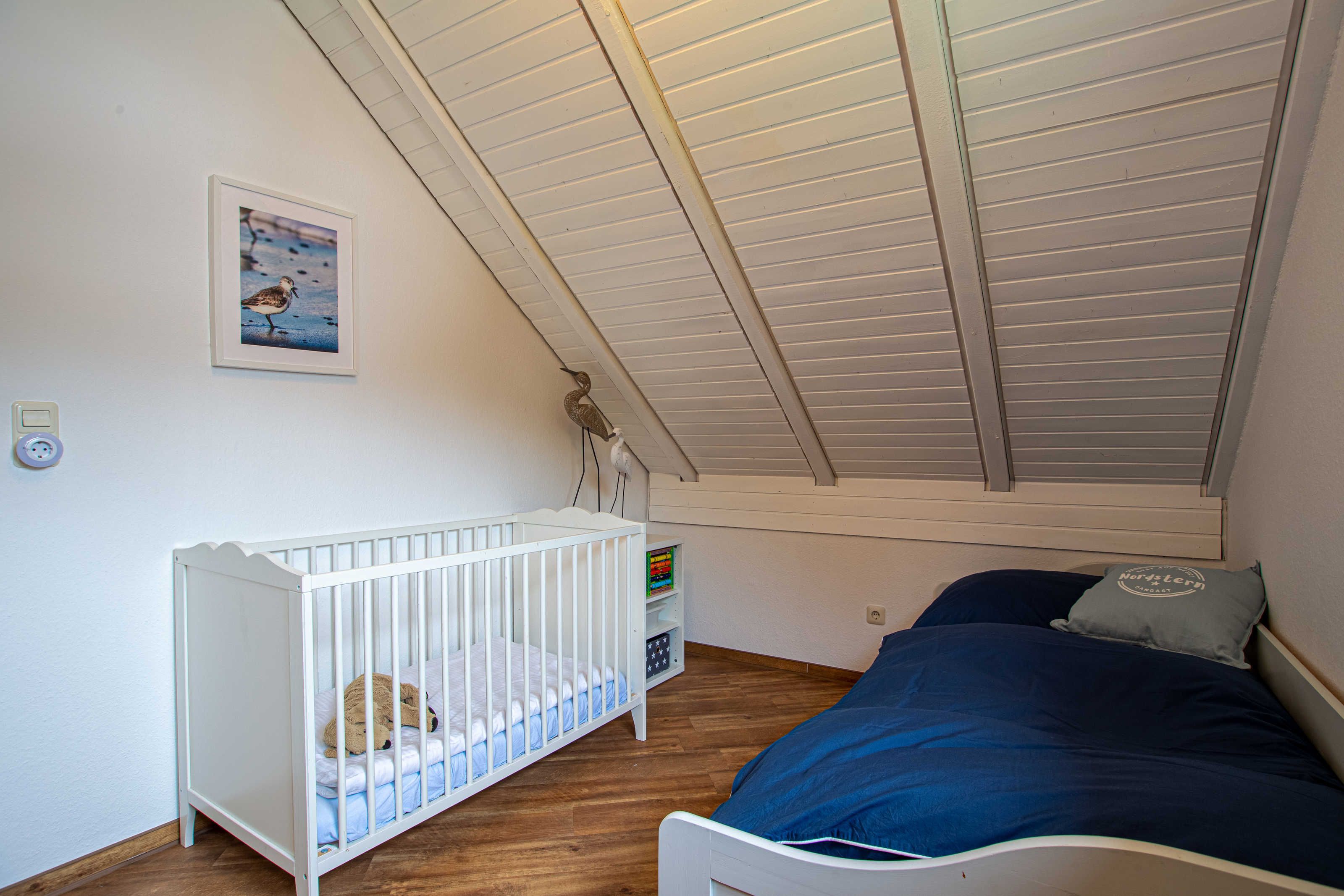 Im ersten Obrgeschoss befinden sich drei freundlich und hell eingerichtete Schlafzimmer. Ein Schlafzimmer mit Doppelbett, ein Zimmer mit Etagenbett sowie das dritte Zimmer mit einem Babybett sowie einem Einzelbett. Auf dieser Ebene ist auch das moderne helle Duschbad mit Waschplatz.