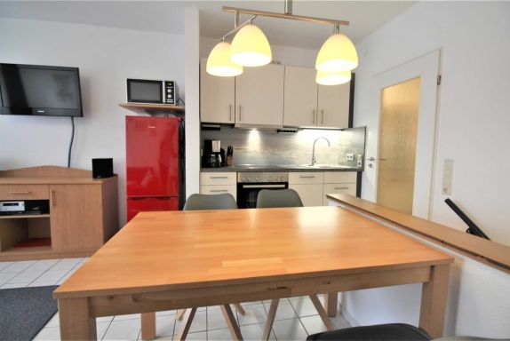 - Großer heller Wohn-/Schlafraum mit bequemer Doppelbettcouch und LED-TV mit Smart-Funktion (Streamen über WLAN kostenfrei möglich) und Kabelfernsehen, separater Essplatz, voll ausgestatteter Küchenbereich mit separatem Kühlschrank und Mikrowelle