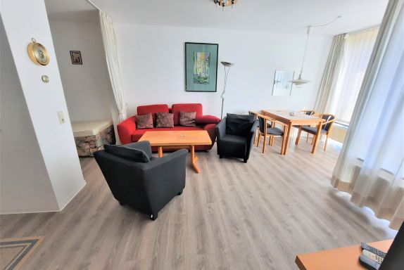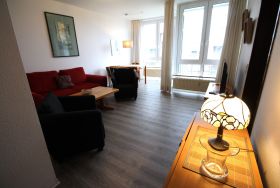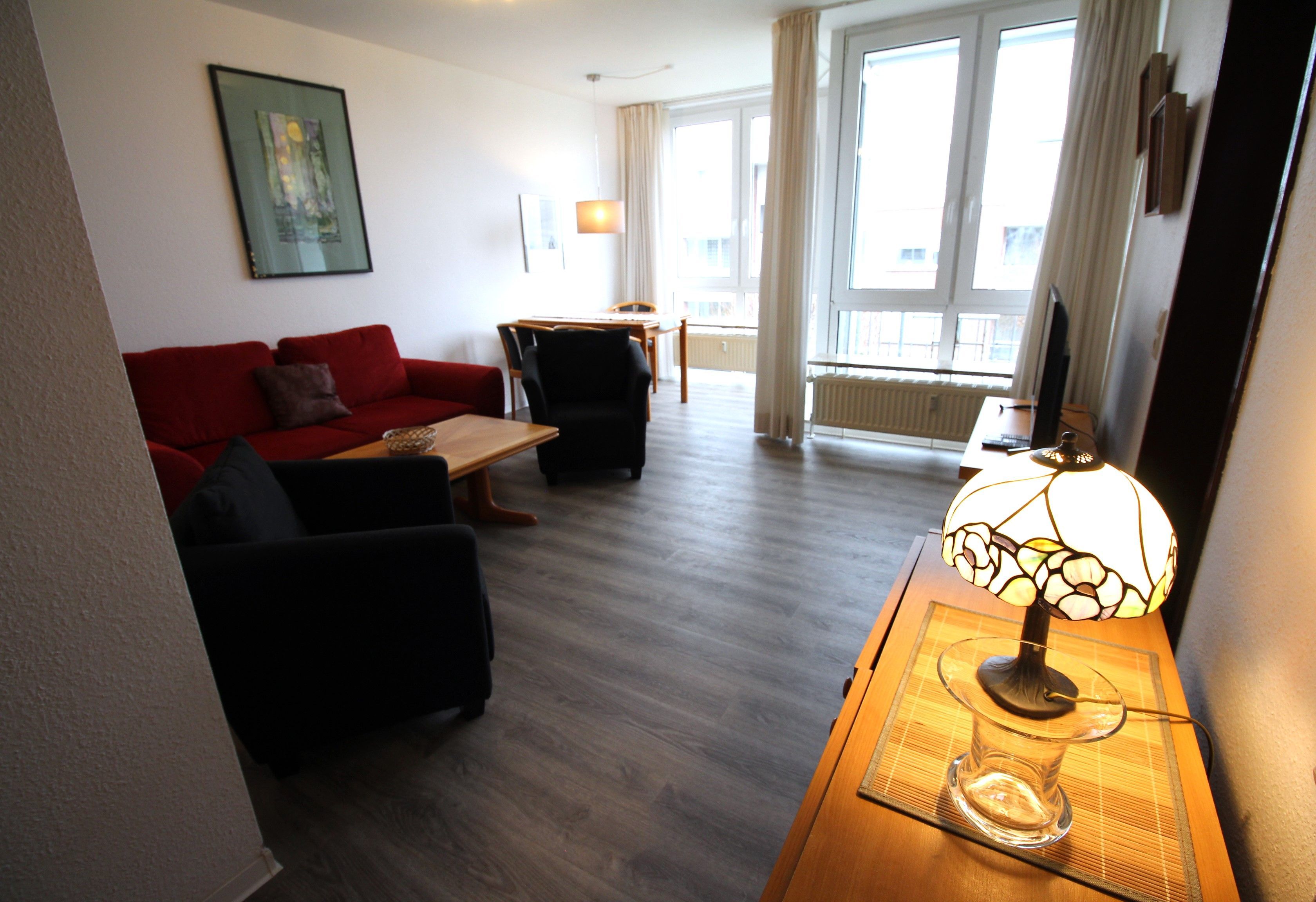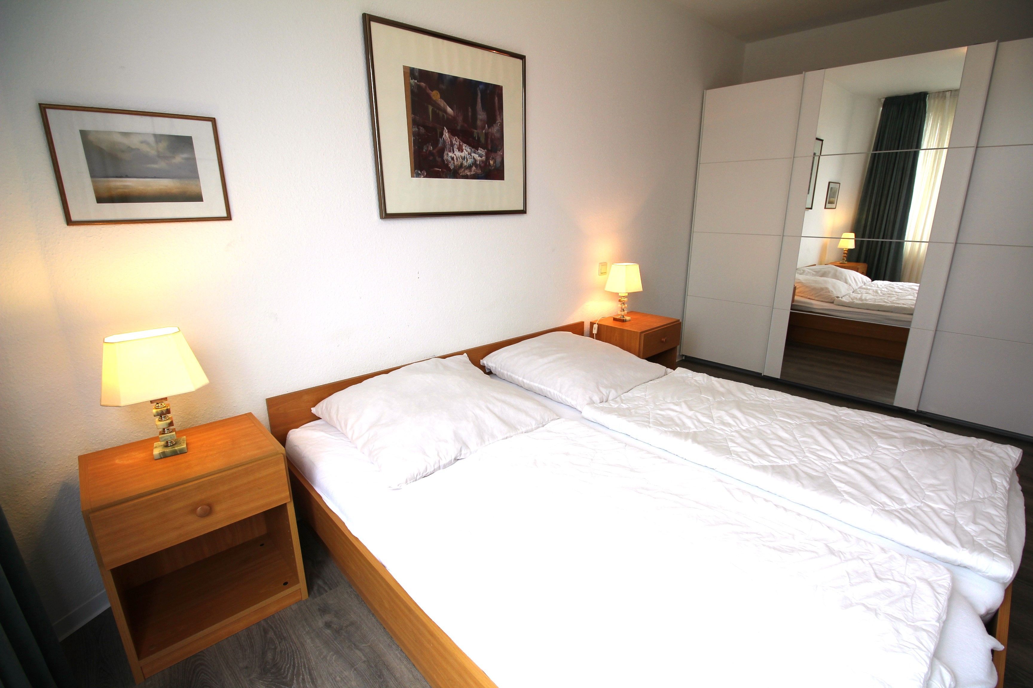 Sie wohnen in einem großzügigem 2-Zimmer-Appartement für bis zu 5 Personen auf 57 m² Wohnfläche. Ein Schlafzimmer mit Doppelbett (180 cm x 200 cm, durchgängige Matratze), großer heller Wohn-/Schlafraum mit bequemer Bettcouch, offene Schlafnische mit Einzelbett, heller separater Essplatz, voll ausgestatteter Küchenbereich mit Mikrowelle, Dusche/WC, Balkon, SAT-TV, Telefon und Aussenstellplatz für PKW.
