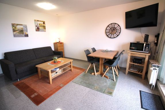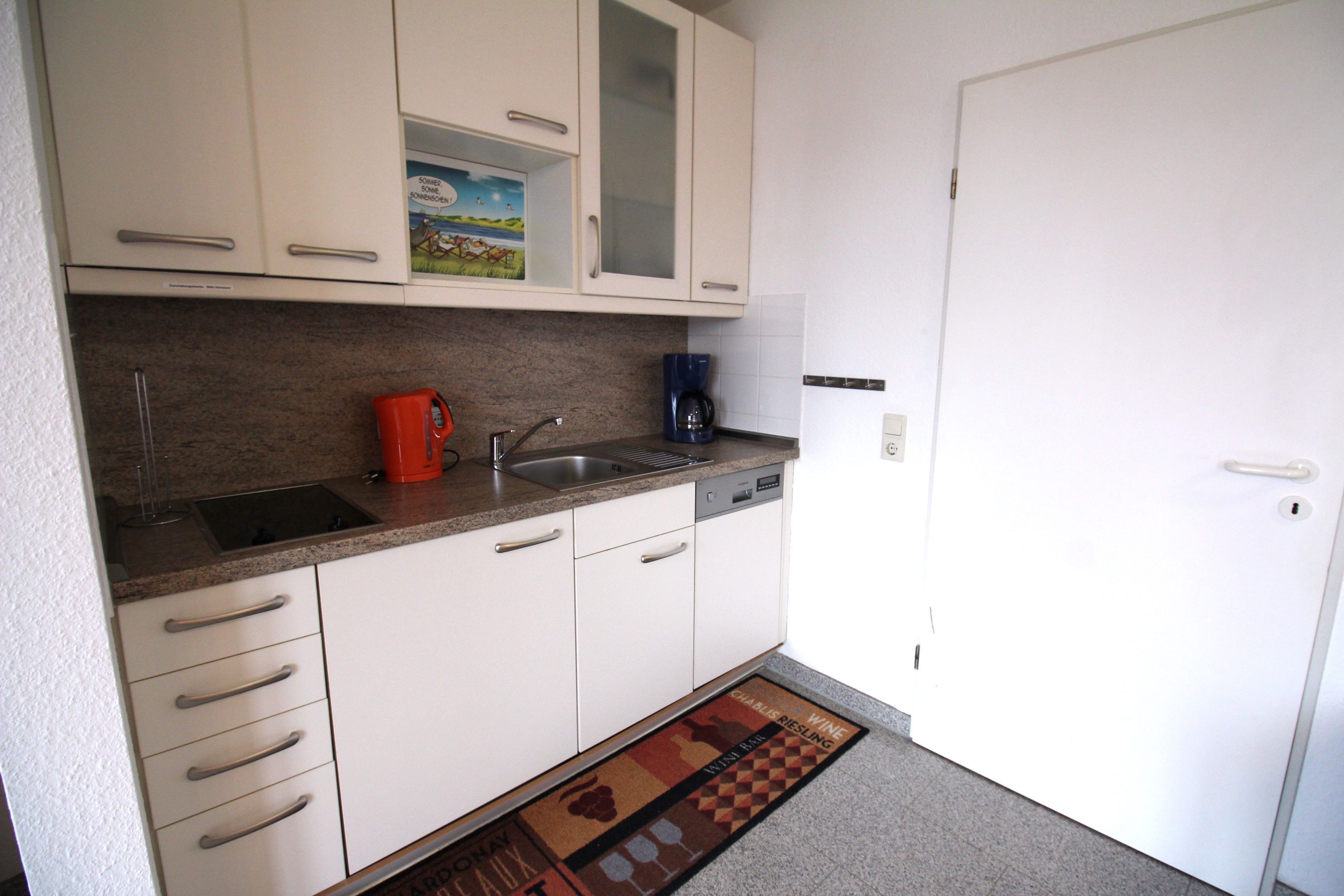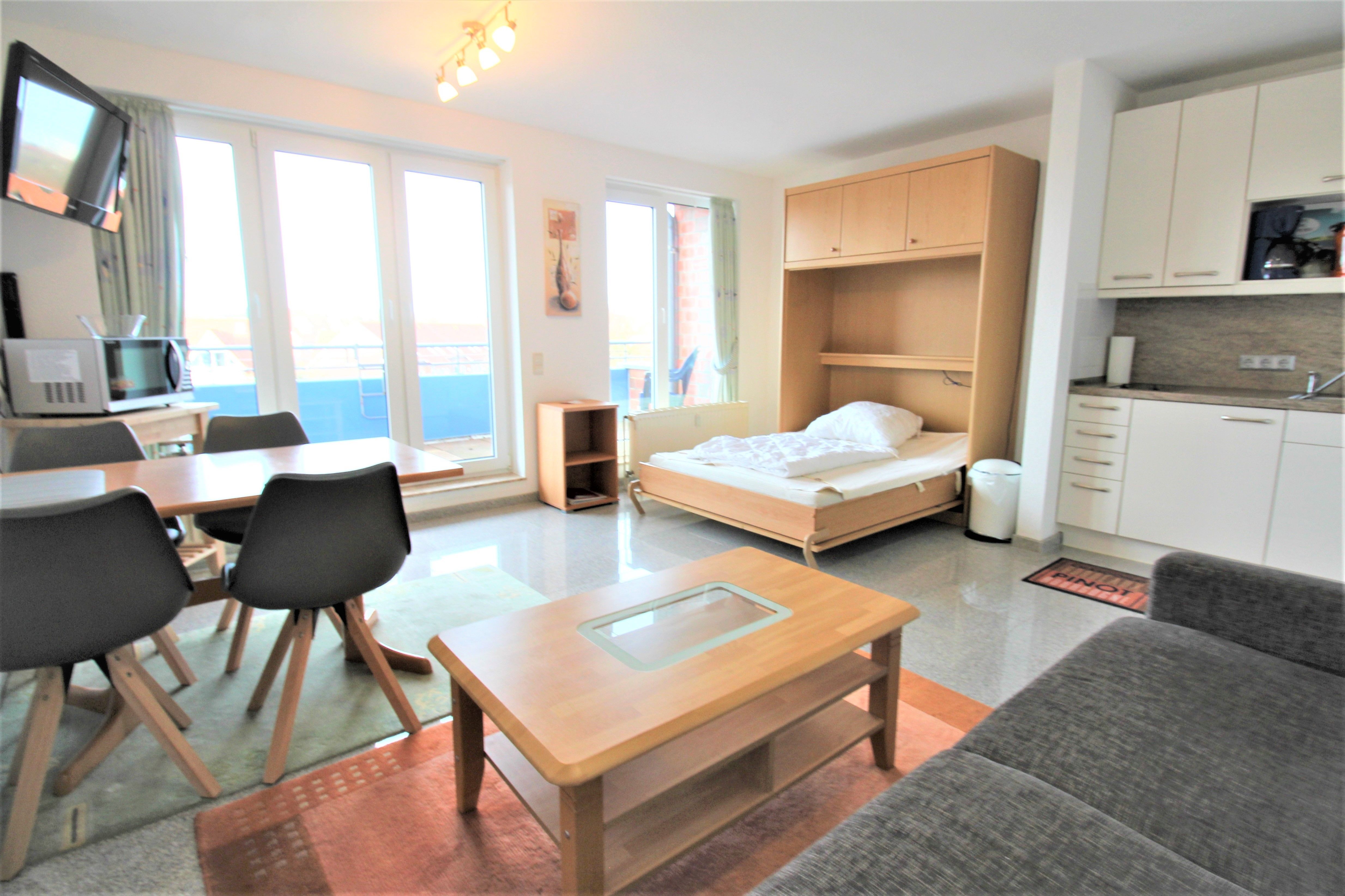 Wohn-/ Schlafraum mit Doppelschrankbett (140 cm x 190 cm), bequeme Doppelschlafcouch, separater Essplatz, voll ausgestatteter Küchenbereich mit 2-Platten-Cerankochfeld, Mikrowelle, Geschirrspüler, Toaster, Wasserkocher, Kaffeemaschine, Eierkocher, Dusche/WC, Sat TV,DVD Player, Radio, Staubsauger, großer Balkon, PKW Stellplatz direkt vor dem Haus.