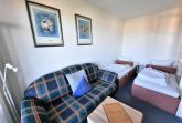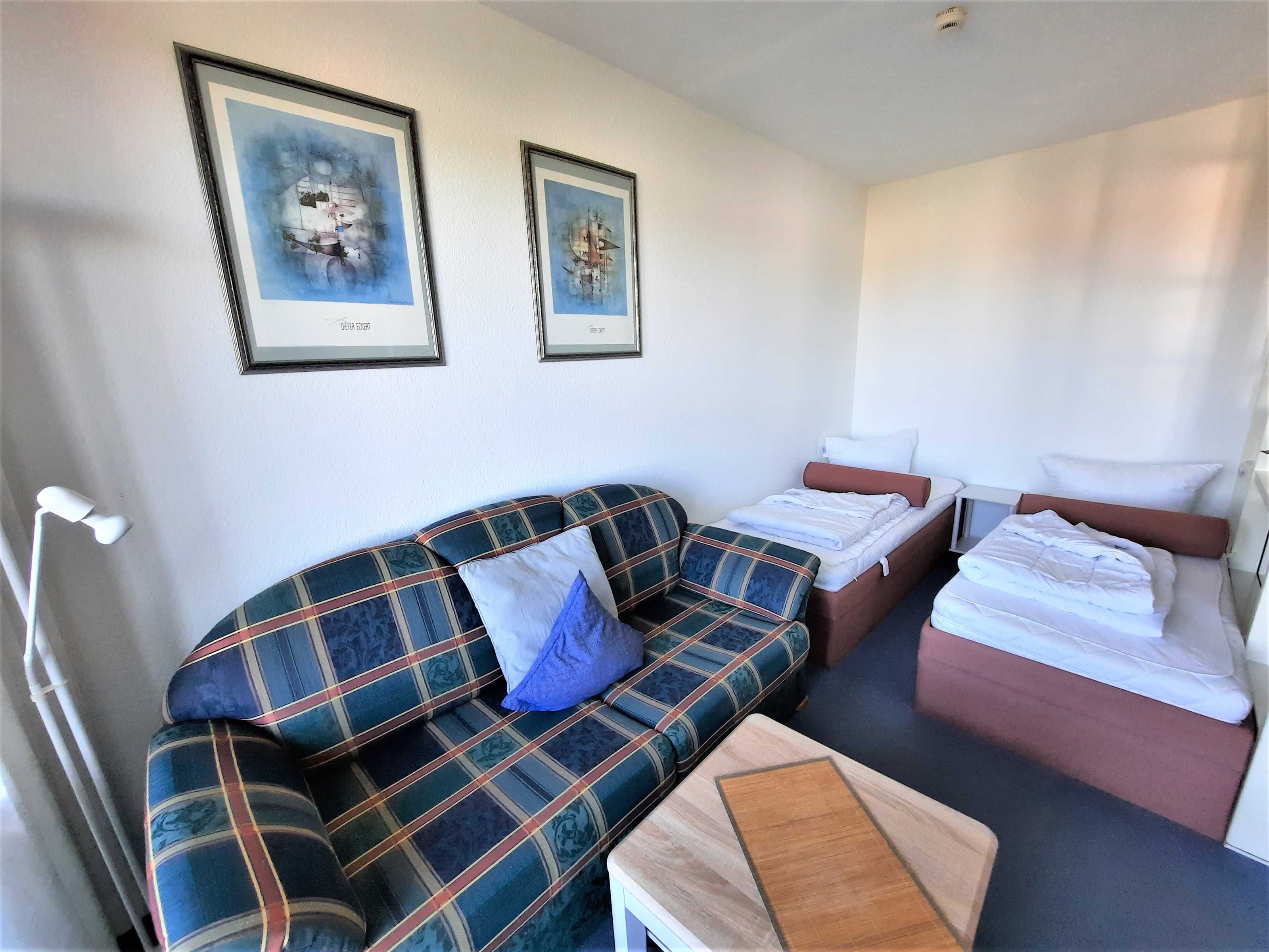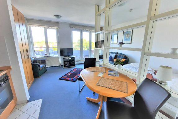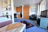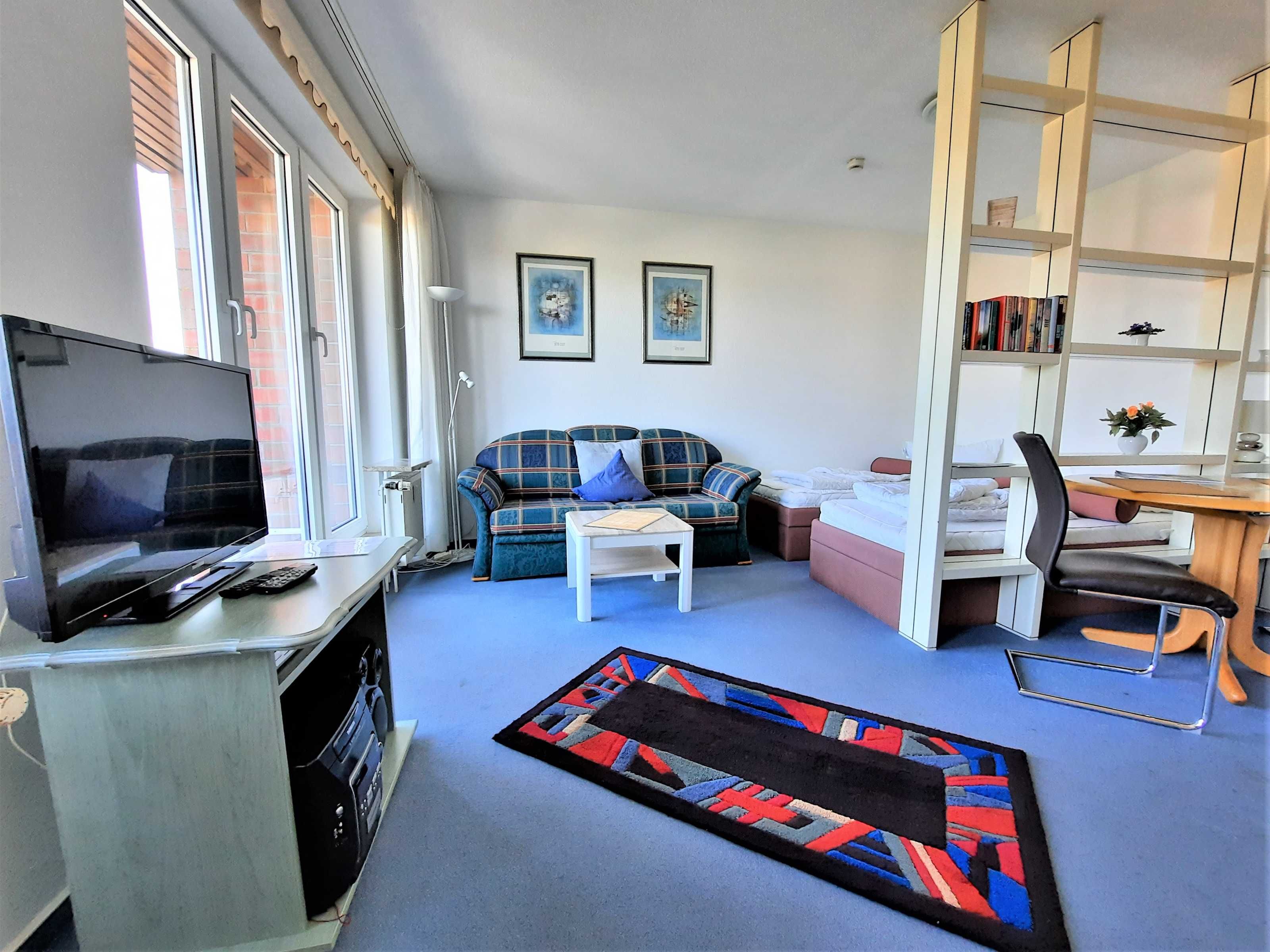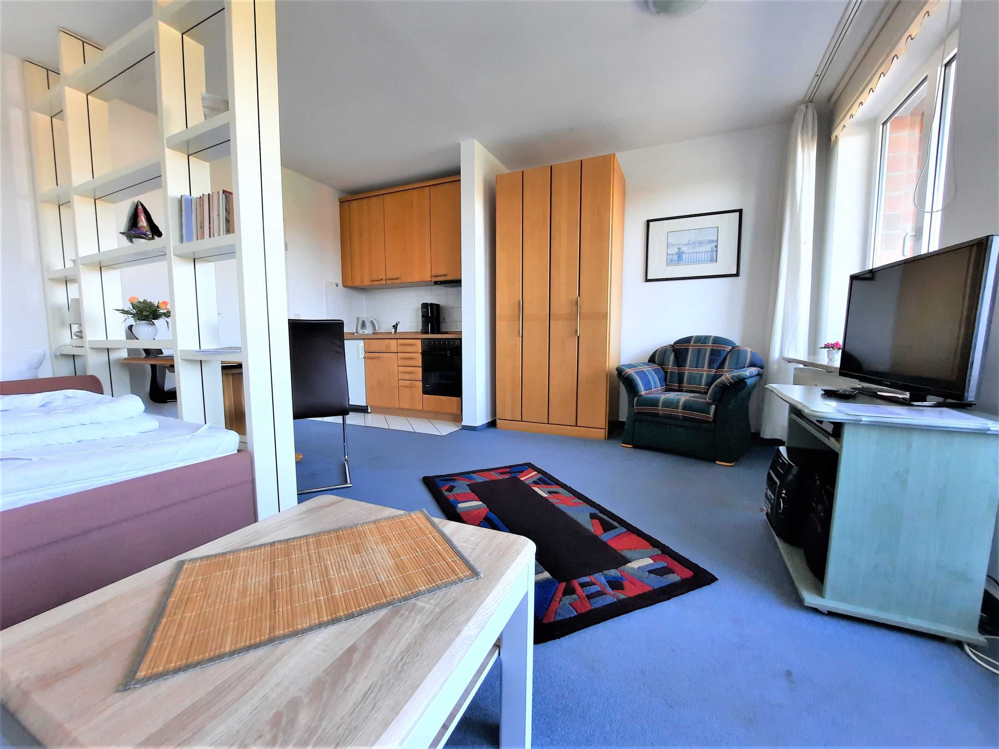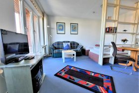 Wohnraum getrennt, voll ausgestatteter Küchenbereich, Dusche/WC, großer Balkon, SAT-Flachbild-TV.