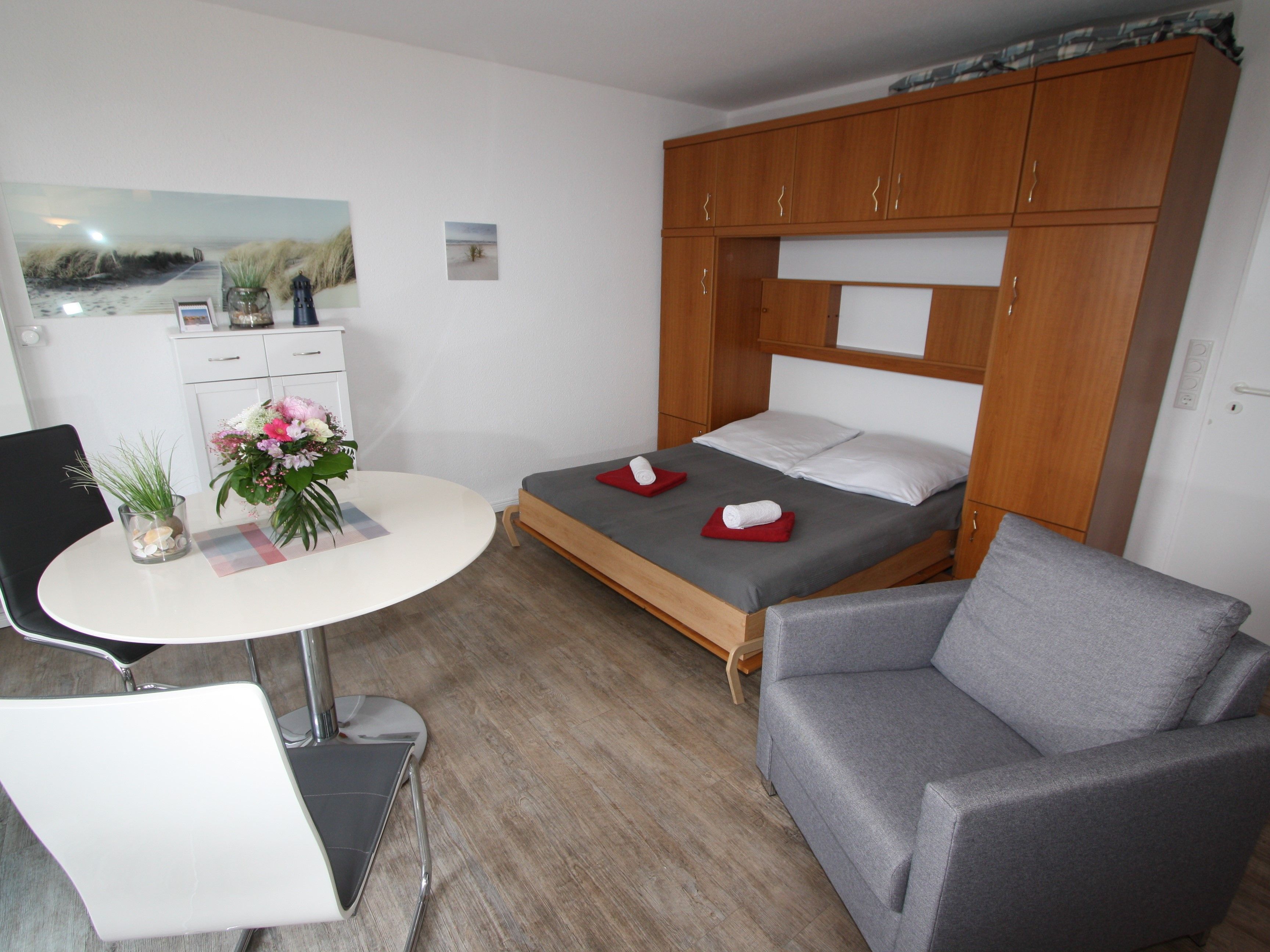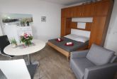 Wohn-/ Schlafraum mit bequemen Doppelschrankbett und LCD-Fernseher, Doppelschlafcouch, separatem Essplatz.